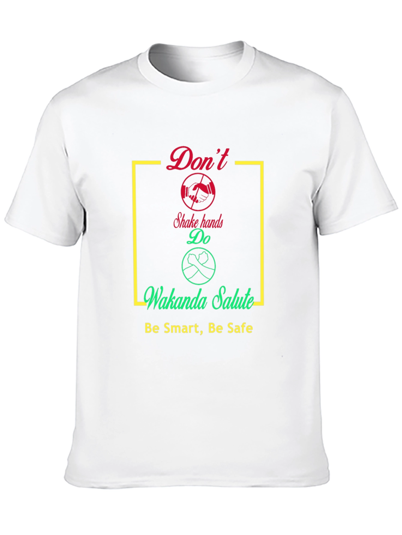 Stay safe and stylish with this unique graphic t-shirt. The design features a clear message: "Don't Shake hands Do Wakanda Salute", promoting a fun and safe way to greet others. The design is encased in a yellow box. Made from comfortable, breathable fabric, this black tee is perfect for everyday wear. The vibrant graphic print ensures you'll stand out while spreading an important message. Ideal for casual outings, social events, or simply lounging at home, this t-shirt combines fashion with a touch of responsibility. Show your support for safety in a trendy way!
