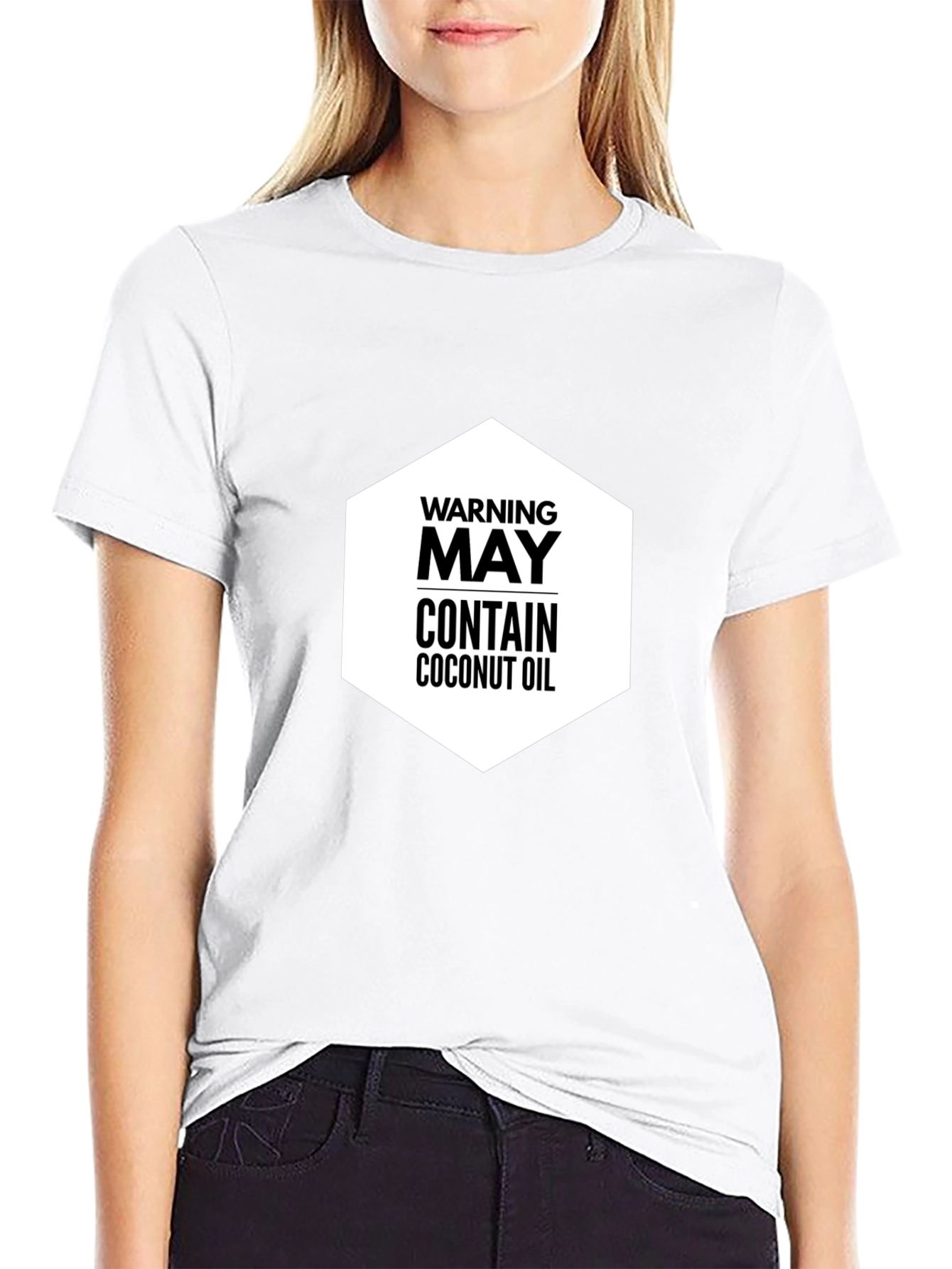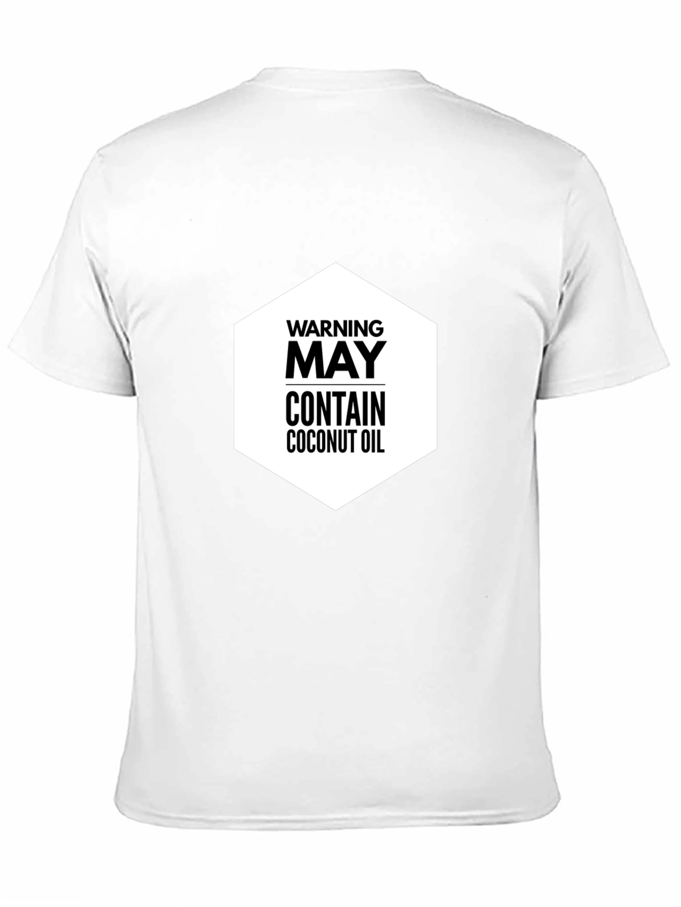 This black t-shirt features a bold and humorous graphic design. The print, centered on the chest, consists of the words 'WARNING,' 'MAY CONTAIN,' and 'COCONUT OIL' stacked in a clear, sans-serif font within a white hexagon. This unique tee is perfect for individuals with a sense of humor. The shirt is made of what appears to be a soft, comfortable material. This t-shirt is ideal for casual outings, relaxed weekends, or as a conversation starter. Get yours today!
