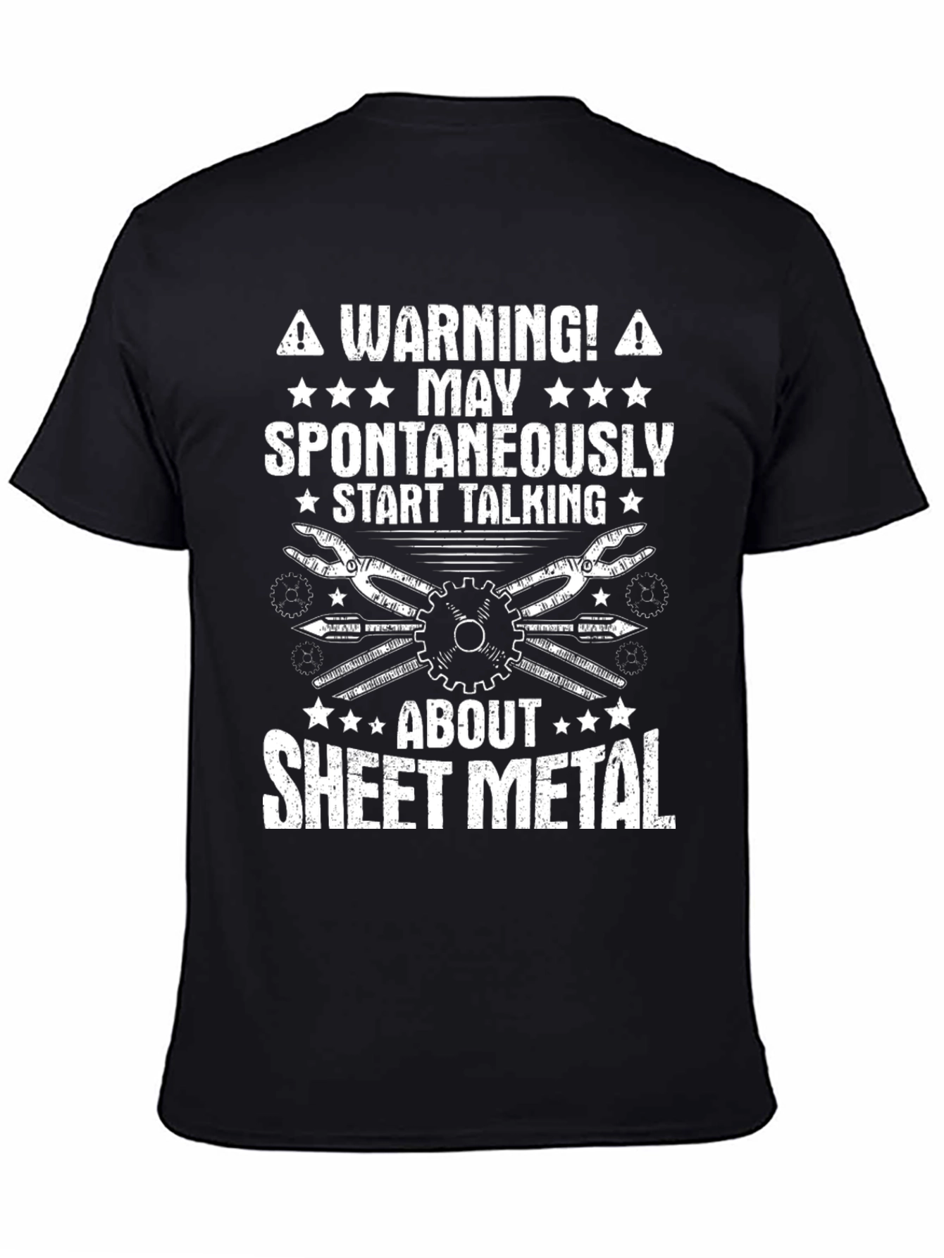 This black t-shirt features a humorous design for sheet metal enthusiasts. The graphic boldly states, 'A WARNING! I MAY SPONTANEOUSLY START TALKING ABOUT SHEET METAL,' surrounded by stars, gears, and tools. Made from comfortable fabric, this tee is perfect for casual wear, work, or as a gift for the passionate sheet metal worker in your life. Show off your love for the trade with this unique and eye-catching shirt, sure to spark conversations and turn heads. Get yours today and let the world know you're serious about sheet metal!