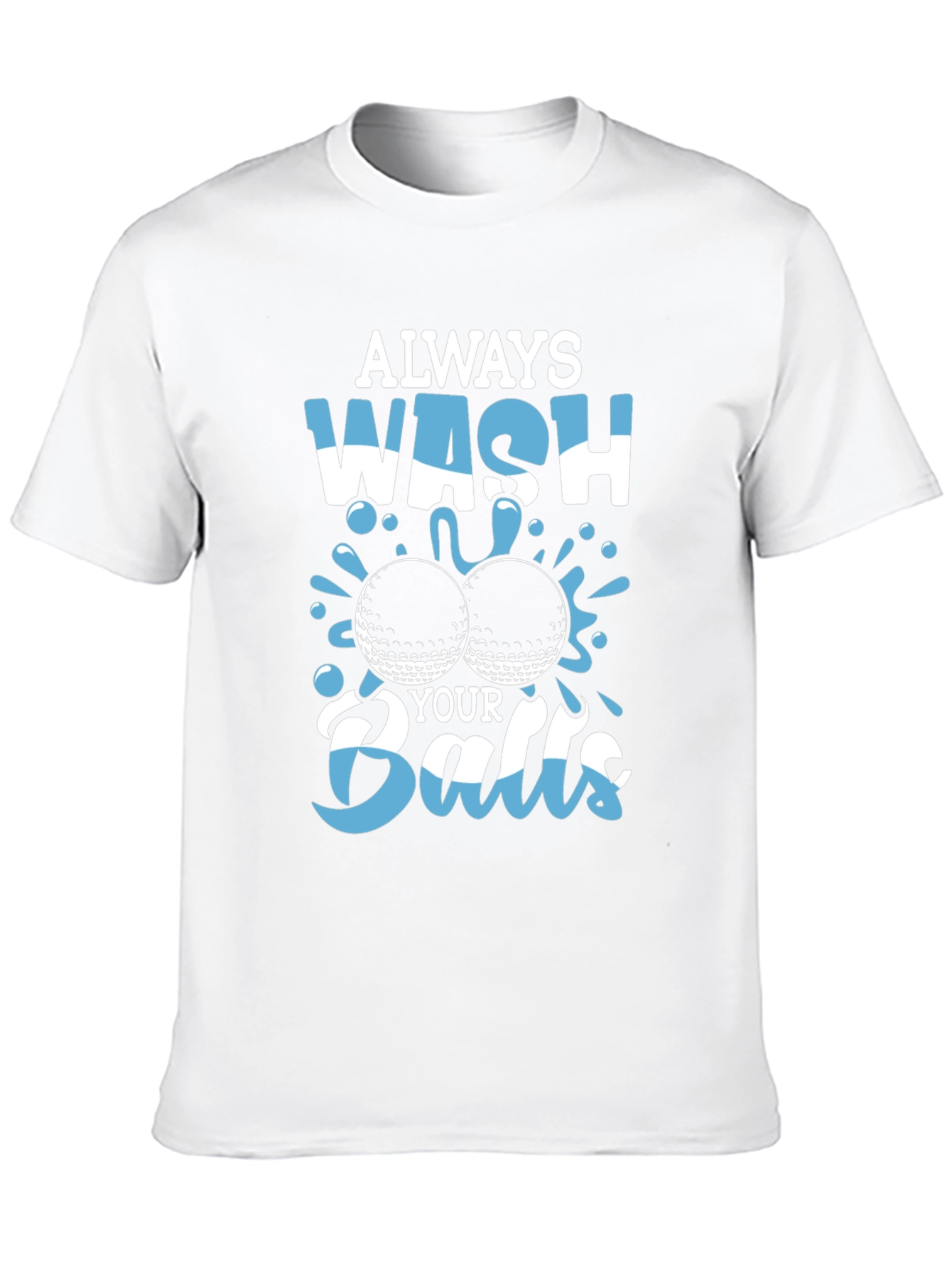 This black T-shirt features a humorous golf-themed design that is sure to get a laugh. The design includes two golf balls with water droplets and the words "Always Wash Your Balls" in a stylish font with a light blue fill. Made from what appears to be a comfortable cotton or cotton blend fabric, this T-shirt offers both style and comfort. Ideal for golf enthusiasts with a sense of humor, it's perfect for wearing on the golf course, at casual gatherings, or as a fun gift. Show off your love for golf with this unique and eye-catching tee!