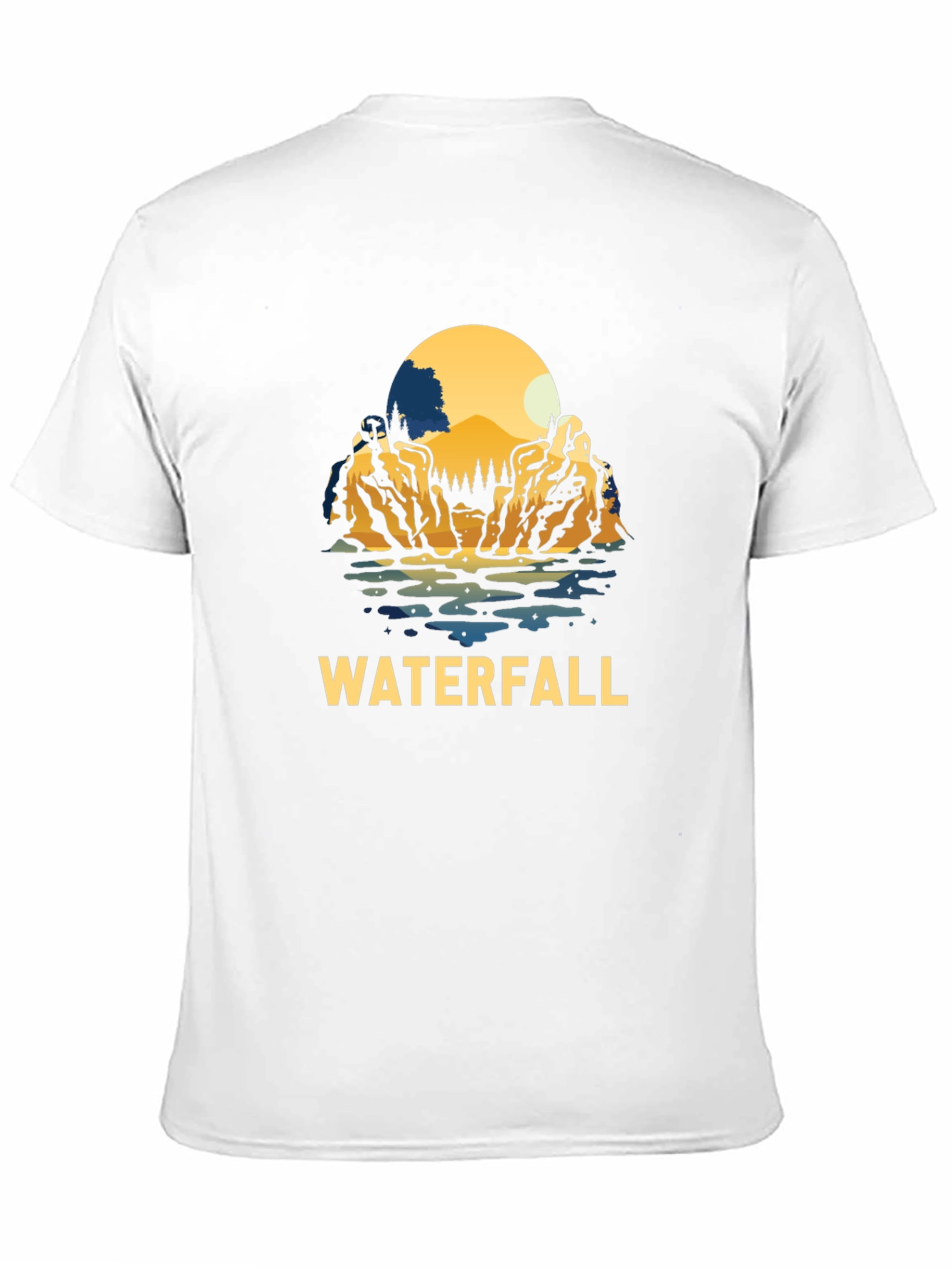 This striking black t-shirt features a bold, eye-catching graphic of a scenic waterfall landscape. The design showcases a vibrant color palette with earth tones and cool blues. The word "WATERFALL" is emblazoned beneath the image. Made from a soft, breathable fabric, this t-shirt provides all-day comfort and is perfect for casual wear. Whether you're exploring the great outdoors or simply relaxing at home, this t-shirt is a stylish way to express your love for nature. Ideal for anyone who appreciates unique designs, this t-shirt is sure to become a favorite in your wardrobe.