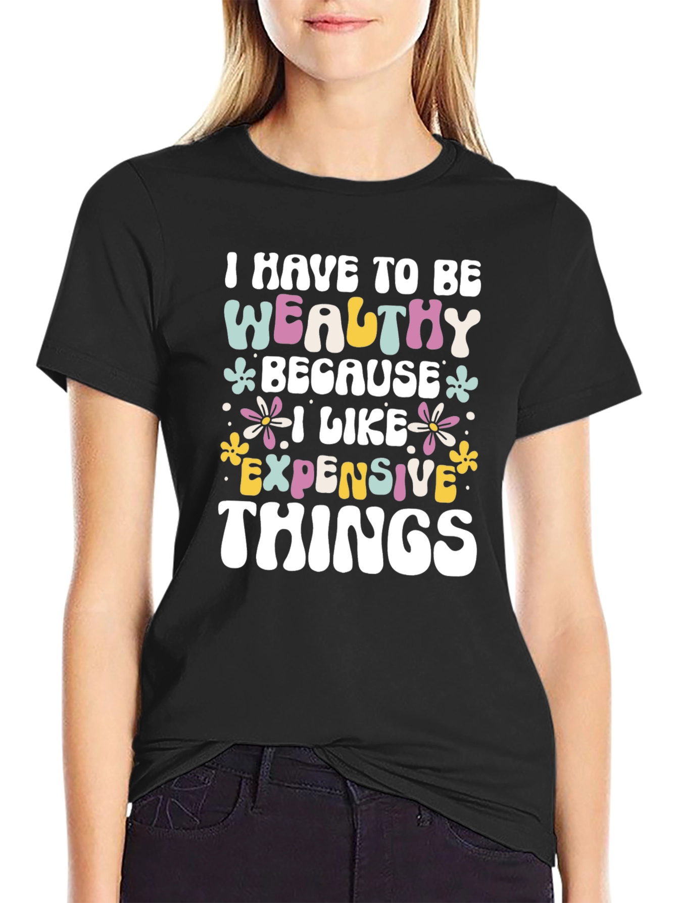 Flaunt your aspirations with this stylish black t-shirt. Featuring a retro-inspired design, the phrase 'I Have to Be Wealthy Because I Like Expensive Things' is printed in a mix of vibrant colors and playful fonts. Floral accents add a touch of whimsy to the overall design. This eye-catching tee is perfect for casual outings, expressing your personality, or as a fun statement piece. Made from comfortable fabric, it's a great conversation starter and a must-have for anyone with a taste for the finer things in life.