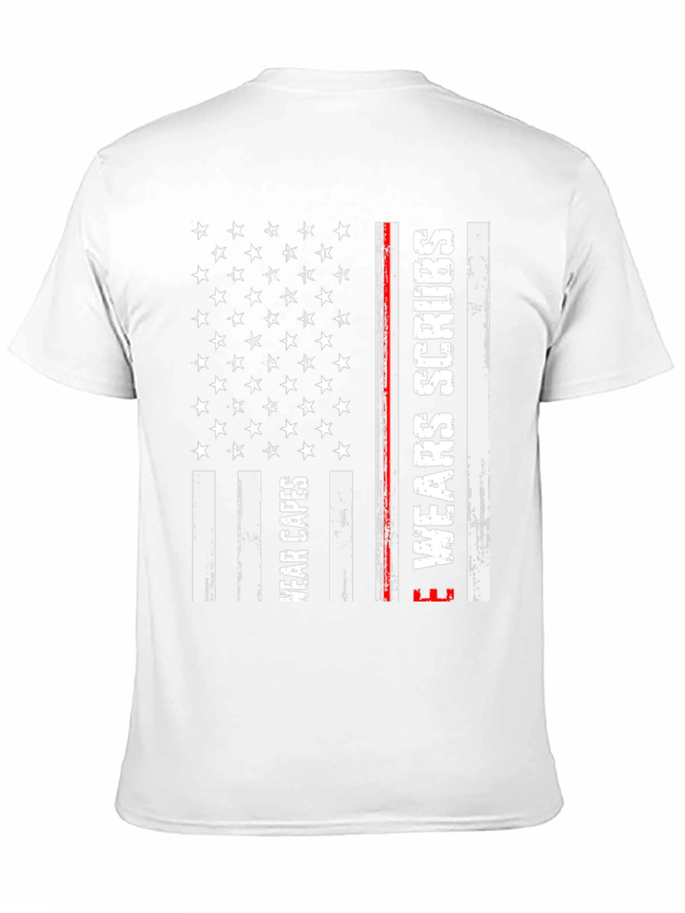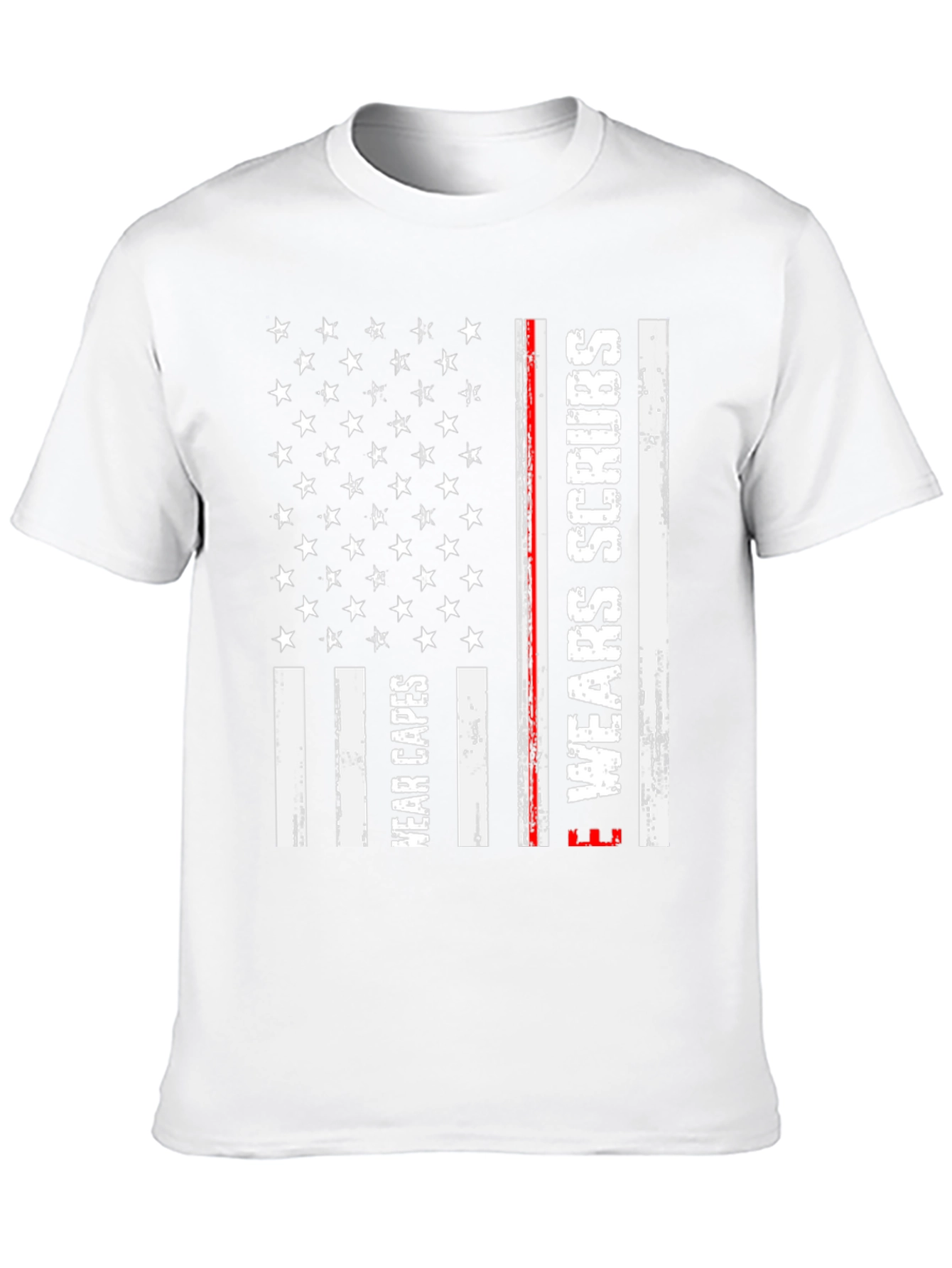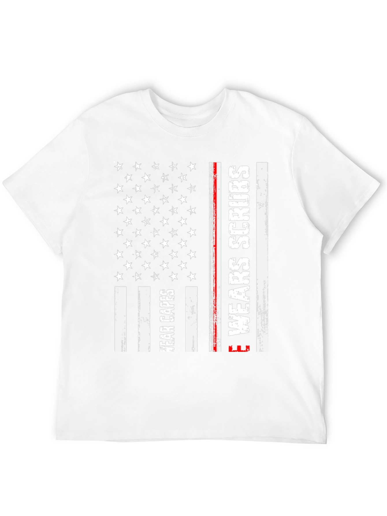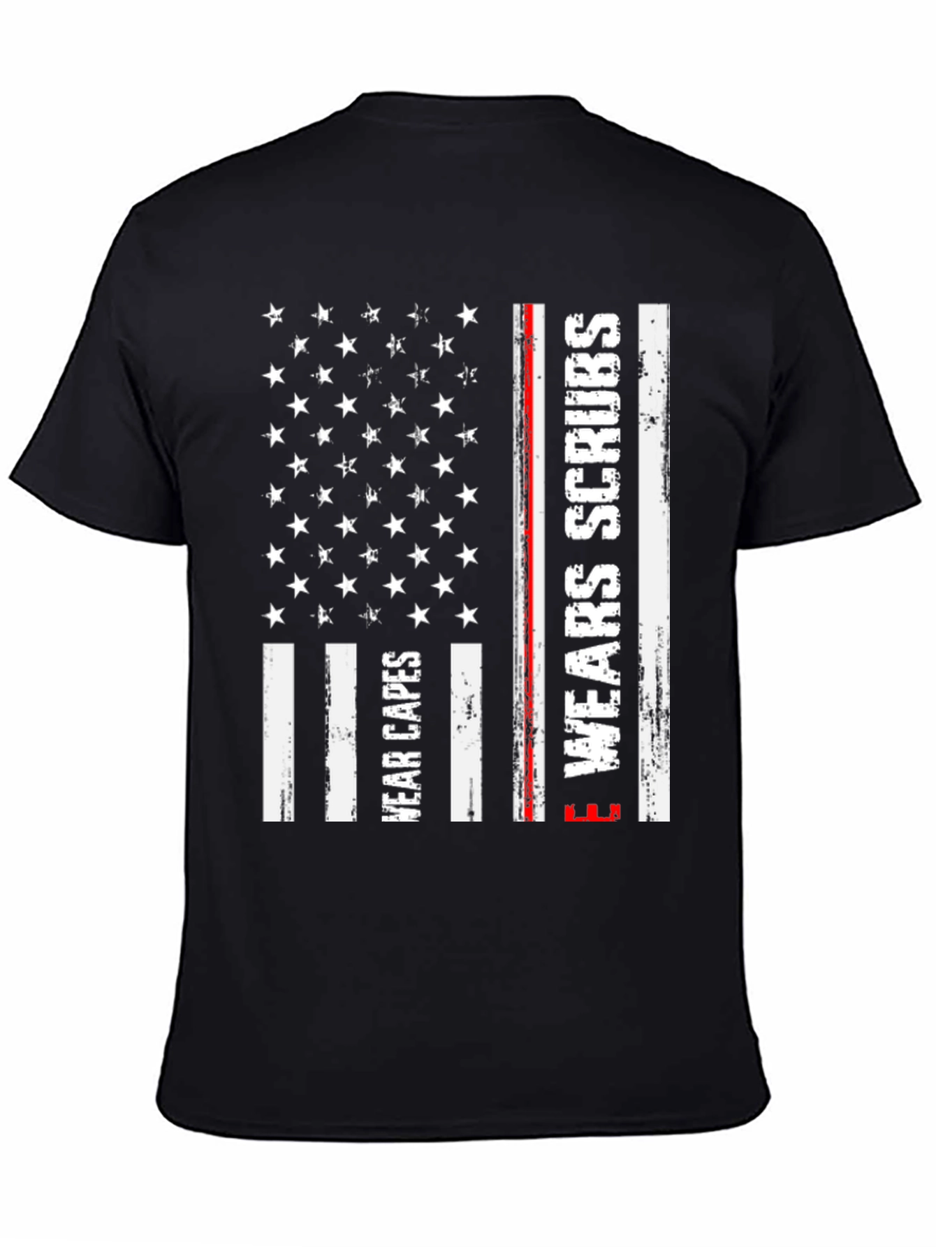 Show your support for healthcare heroes with this stylish black t-shirt. This unique design incorporates elements of the American flag with 'Wear Capes' and 'Wear Scrubs' printed in a distressed white font on the flag's stripes. A thin red line adds a subtle detail. Made from a comfortable-looking fabric, this tee is perfect for everyday wear, medical professionals, or anyone who wants to honor those who work tirelessly in healthcare. This t-shirt makes a statement and lets you show your appreciation in a fashionable way.