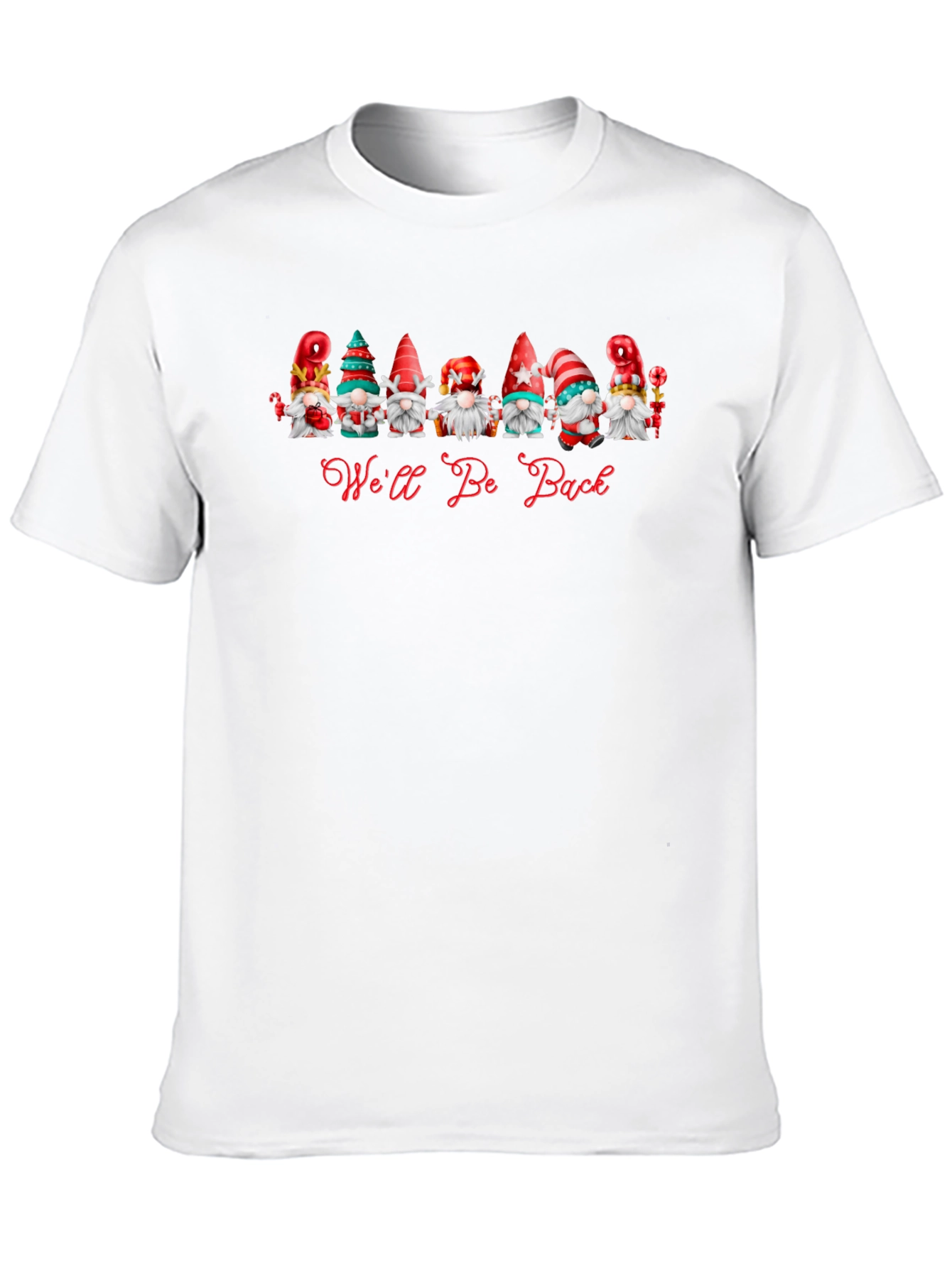 Show off your holiday cheer with this fun 'We'll Be Back' gnome t-shirt! This black tee features a vibrant graphic of festive gnomes wearing a variety of red, green, and white hats. The playful font adds to the whimsical appeal. Made from soft, breathable fabric, this shirt offers a comfortable fit for everyday wear. Perfect for holiday parties, casual outings, or cozy nights in. This unique tee is a great way to spread some holiday spirit and make a statement.
