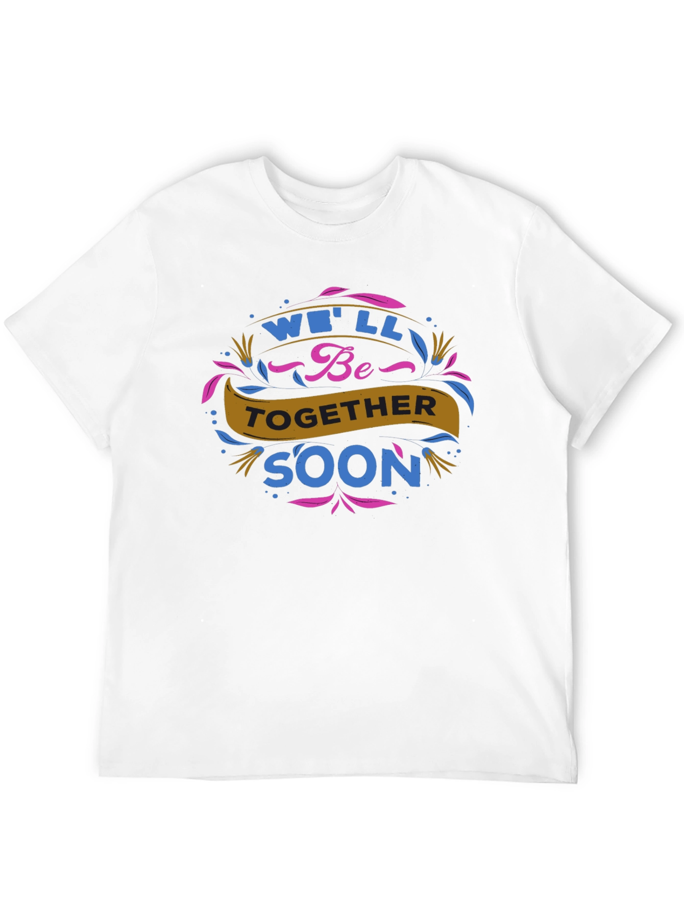 Embrace connection with this black graphic tee. A vibrant, circular design features the uplifting message "We'll Be Together Soon" in pink, blue, and gold on a banner. Delicate floral accents surround the central text, adding a touch of cheer. The classic black backdrop makes the vibrant design pop, offering versatility for casual wear. This T-shirt is perfect for staying stylish and hopeful, whether you're relaxing at home or meeting friends. It's a wearable reminder of the bonds that matter, bringing a cheerful message to your everyday style.