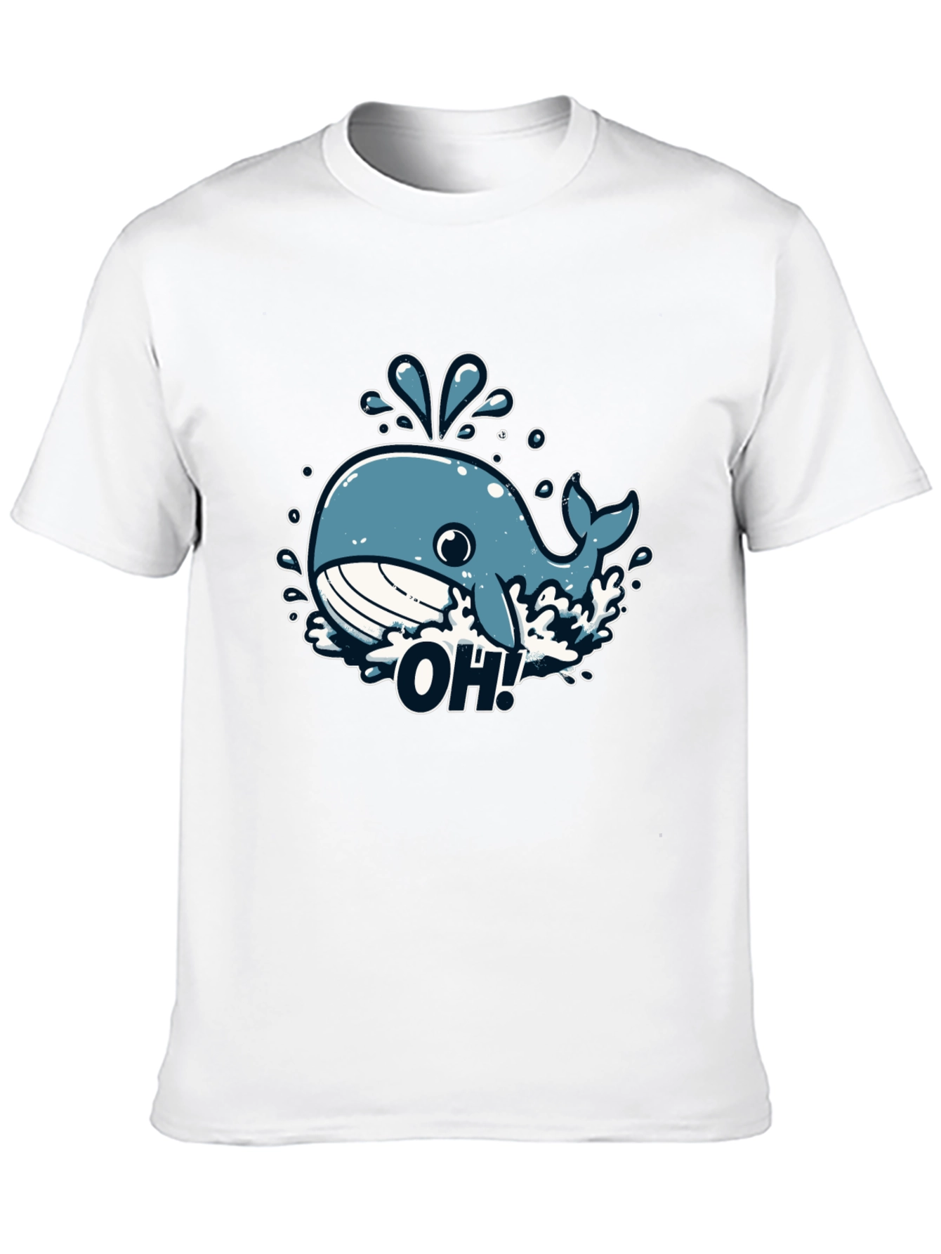 Dive into style with this playful black T-shirt featuring an adorable cartoon whale graphic. The blue whale is depicted mid-splash, complete with water droplets and the amusing text "OH!". This eye-catching design is perfect for casual wear, adding a splash of fun to any outfit. Made from comfortable, breathable fabric, it ensures all-day comfort whether you're out and about or relaxing at home. Stand out from the crowd and express your whimsical side with this unique tee. It's an ideal gift for whale lovers and anyone who appreciates a touch of humor in their wardrobe. Add some 'whale-come' charm to your day!