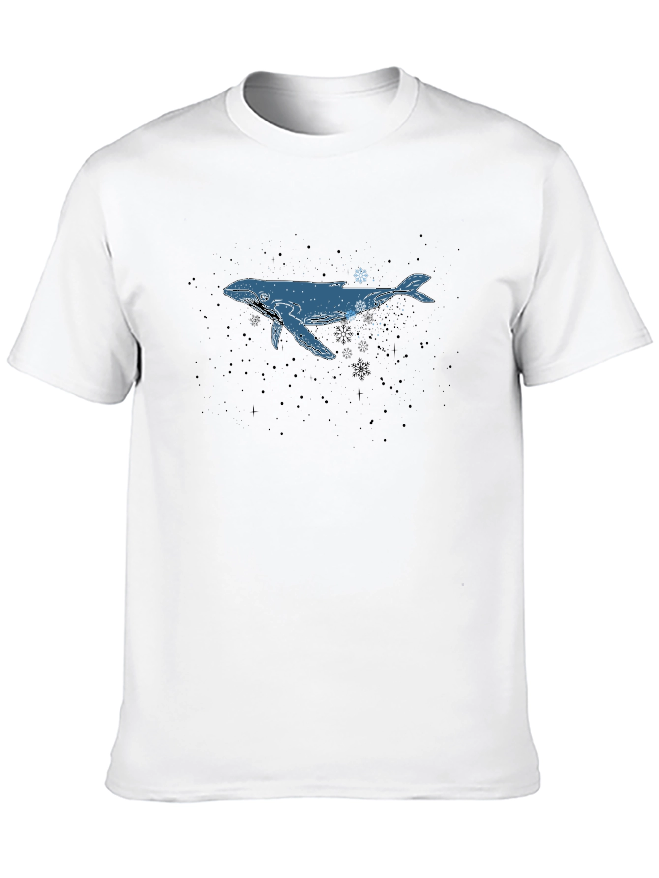 This classic black t-shirt features a unique and eye-catching design. A blue whale graphic is prominently displayed, adorned with snowflake accents. The soft fabric ensures a comfortable fit, making it perfect for everyday wear. Show off your love for marine life and winter vibes with this stylish tee. Ideal for casual outings, layering under jackets, or lounging at home. A versatile addition to any wardrobe.