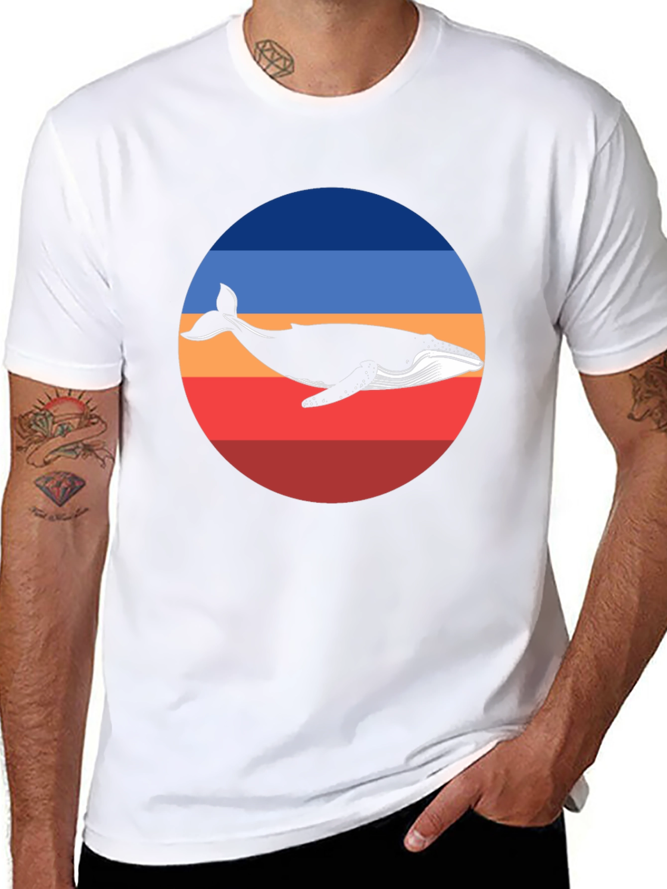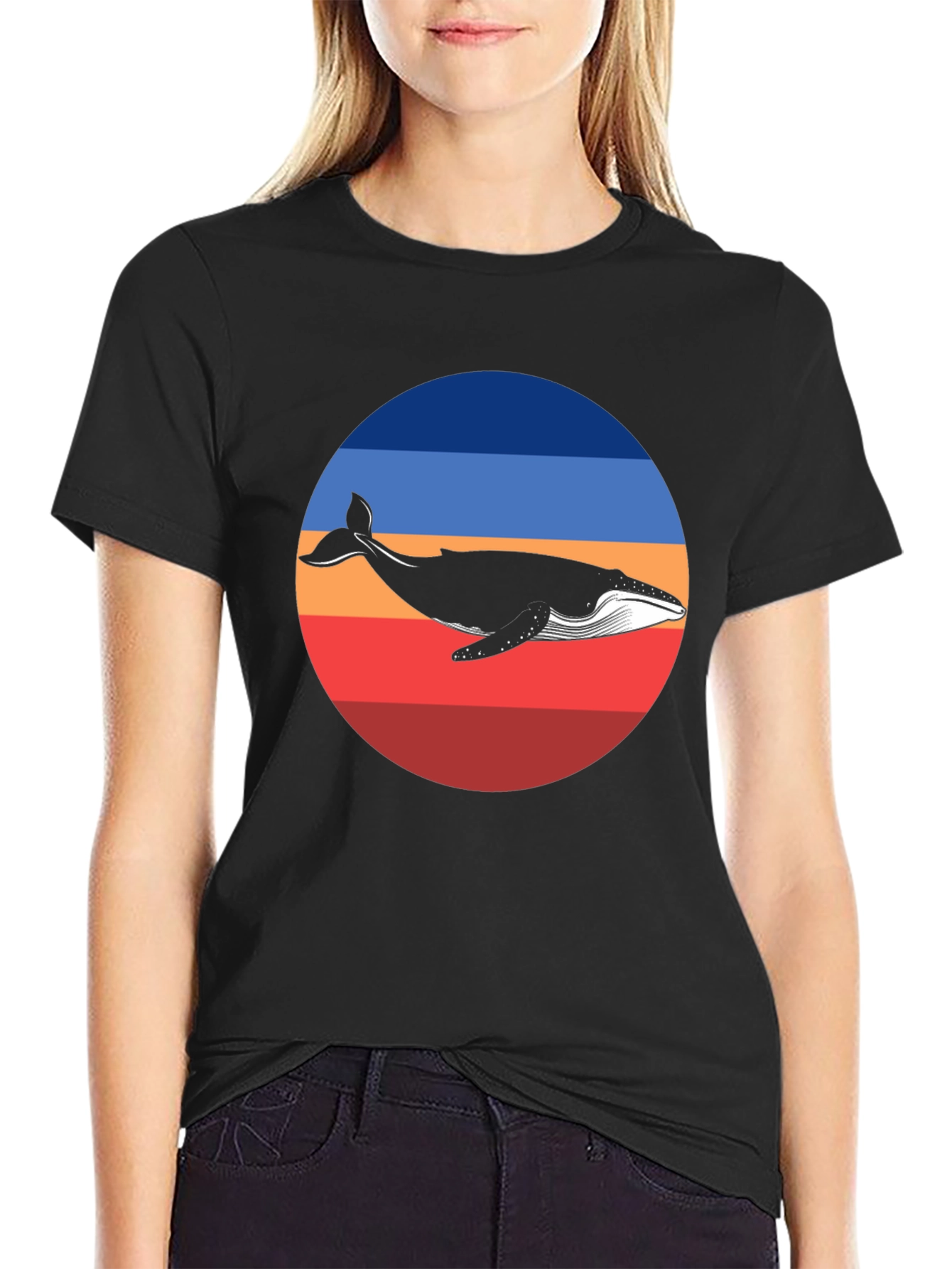 Dive into style with this eye-catching black T-shirt. The design features a striking whale silhouette set against a vibrant, retro-inspired circle with blue, orange, and red bands. Made from soft, breathable fabric, this tee offers both comfort and a unique aesthetic. Its casual crew neck and classic fit make it versatile for everyday wear. Perfect for ocean lovers or anyone looking to add a splash of vintage charm to their wardrobe. Pair it with jeans for a relaxed look or dress it up with a blazer for a stylish twist.