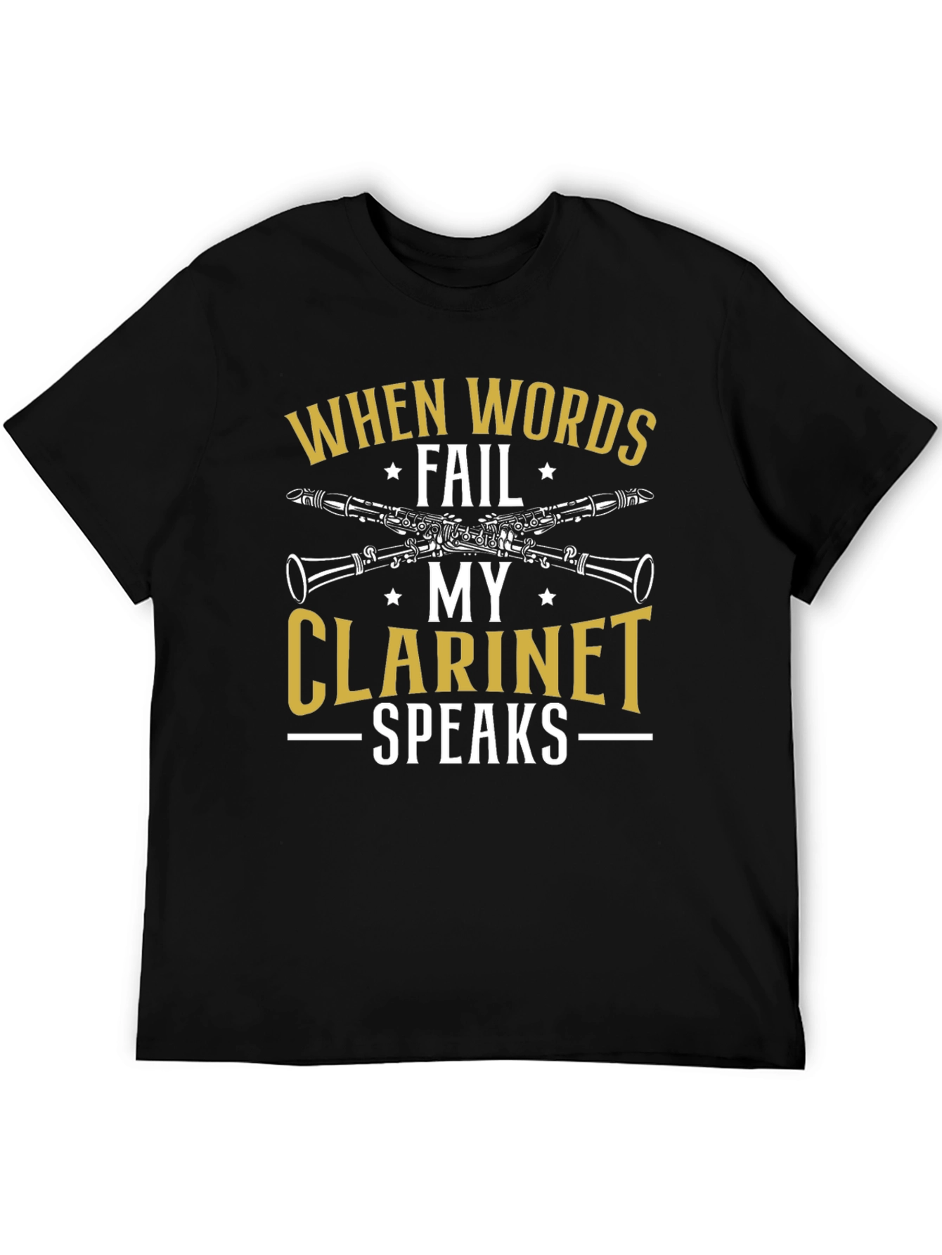 Show your passion with this unique black t-shirt! Featuring a bold design with the text "WHEN WORDS FAIL MY CLARINET SPEAKS" in an eye-catching gold font, complemented by an illustration of two crossed clarinets. Perfect for musicians, band members, and music lovers. Wear it to rehearsals, concerts, or casual outings to express your love for music. Made from comfortable fabric, this shirt offers a great fit and feel, making it a staple in your wardrobe. A must-have for clarinet players!