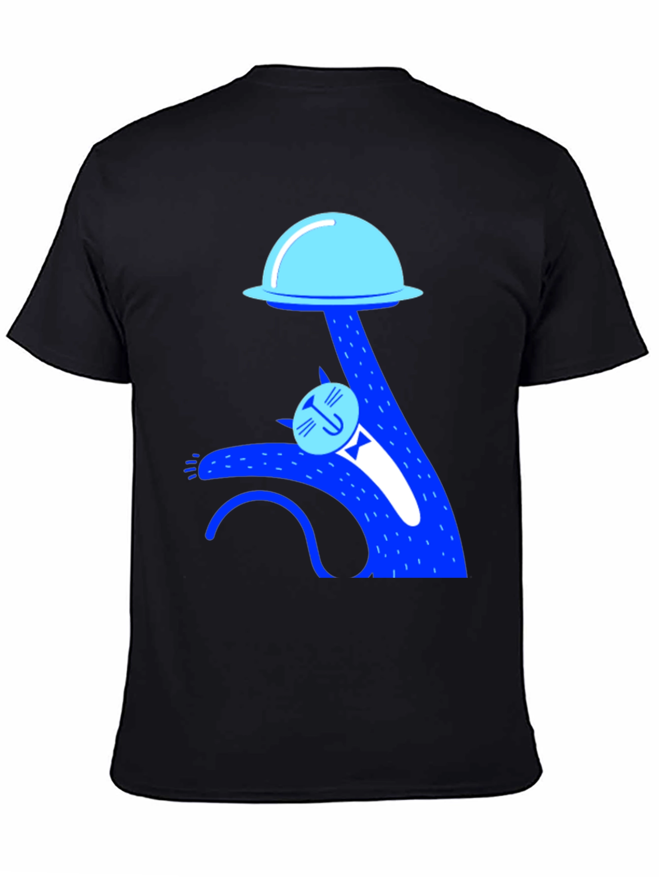 Beam up your style with this unique black t-shirt featuring a playful graphic! A blue cartoon cat, adorned with a bowtie, is seemingly being abducted by a light-blue UFO. The design is eye-catching and fun, perfect for cat lovers and fans of quirky apparel. Made from a comfortable, breathable fabric, this t-shirt is ideal for casual wear, parties, or as a conversation starter. It's a must-have addition to any wardrobe looking for a touch of whimsy and humor. Show off your unique personality with this fun and stylish tee!