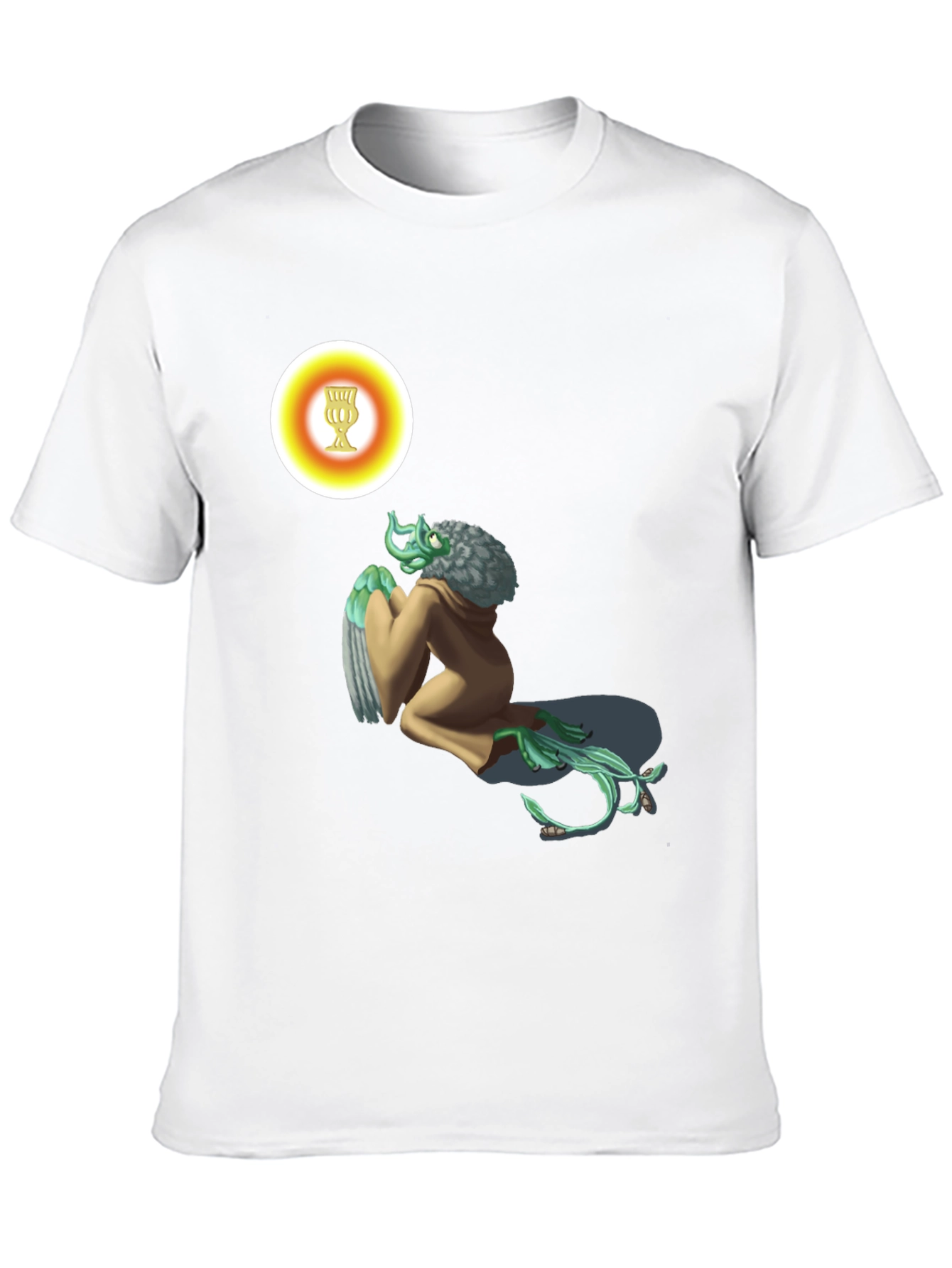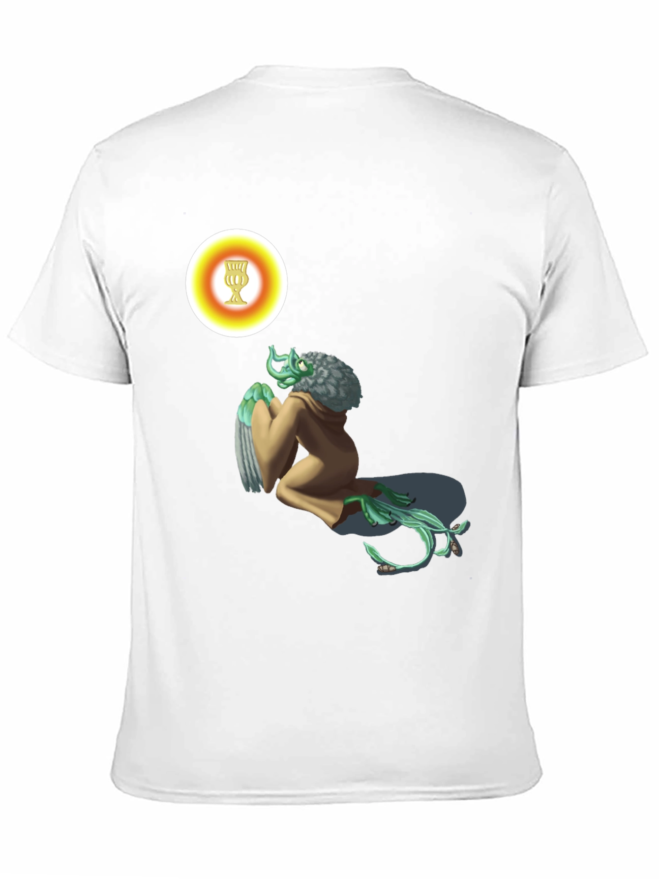 This black t-shirt features a unique and eye-catching graphic design. The design includes a whimsical creature with a flowing, robe-like garment. Above the creature is a bright, circular emblem featuring a chalice. Made from a comfortable-looking fabric, this tee appears ideal for casual wear. The dark backdrop makes the design pop, perfect for those who appreciate quirky and artistic clothing. This t-shirt is sure to spark conversation and add a touch of individuality to any outfit. Ideal for casual outings, relaxed weekends, or expressing your unique style.