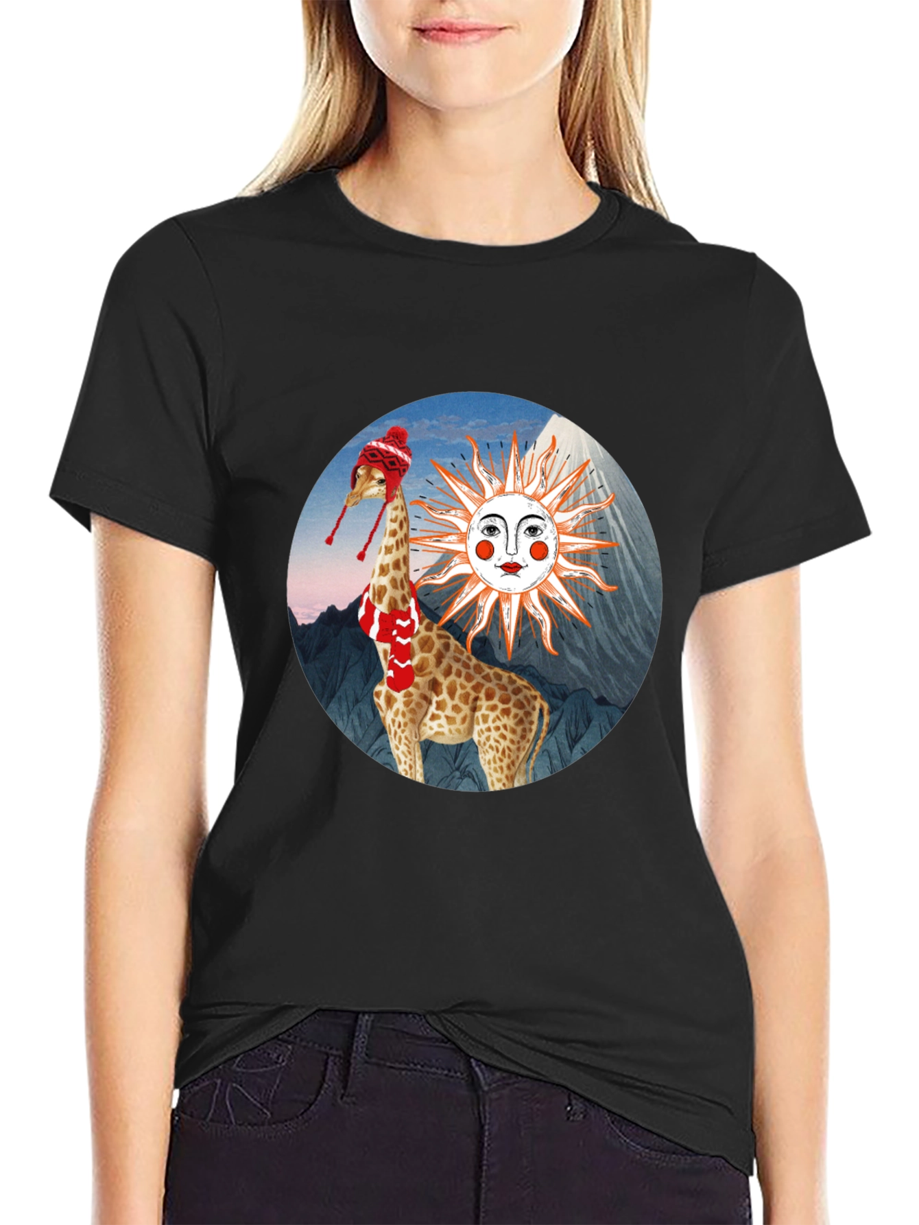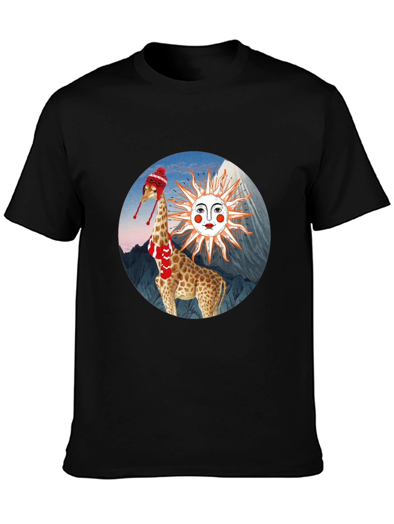 Elevate your wardrobe with this unique t-shirt featuring a playful design. A giraffe wearing a red winter hat and scarf is pictured in front of a sun with a face and a mountain landscape. The design is showcased within a circular frame, set against the black backdrop of the tee. The shirt is comfortable and stylish, making it a perfect choice for casual outings, social gatherings, or as a standout piece in your everyday wear. Show off your fun personality with this eye-catching statement piece! It's sure to spark conversation and smiles wherever you go.