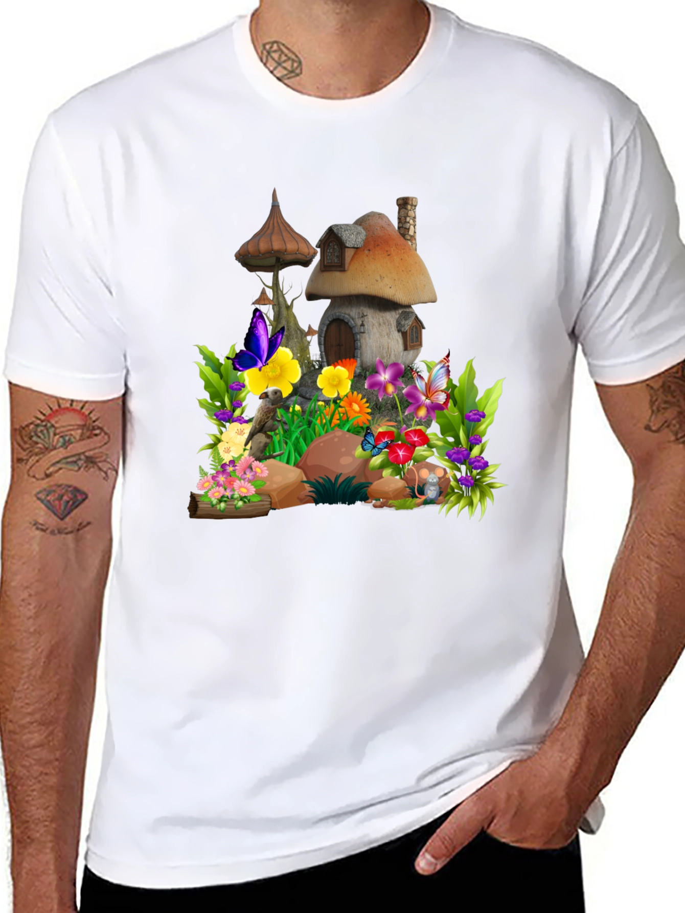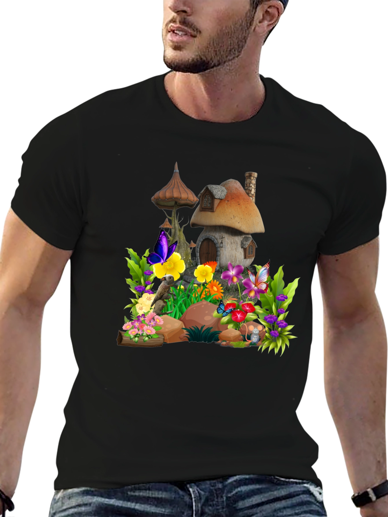 Step into a storybook world with this unique graphic tee. Featuring a charming illustration of a mushroom house surrounded by vibrant flowers and butterflies, this tee brings a touch of fantasy to your everyday wardrobe. The design is printed on a soft, breathable black cotton blend, ensuring both comfort and style. Perfect for casual outings, nature lovers, or anyone who appreciates whimsical art, this t-shirt is sure to turn heads and spark conversations. Pair it with jeans for a relaxed look, or dress it up with a skirt for a more playful ensemble. Embrace your inner child and add a touch of magic to your day with this one-of-a-kind t-shirt.
