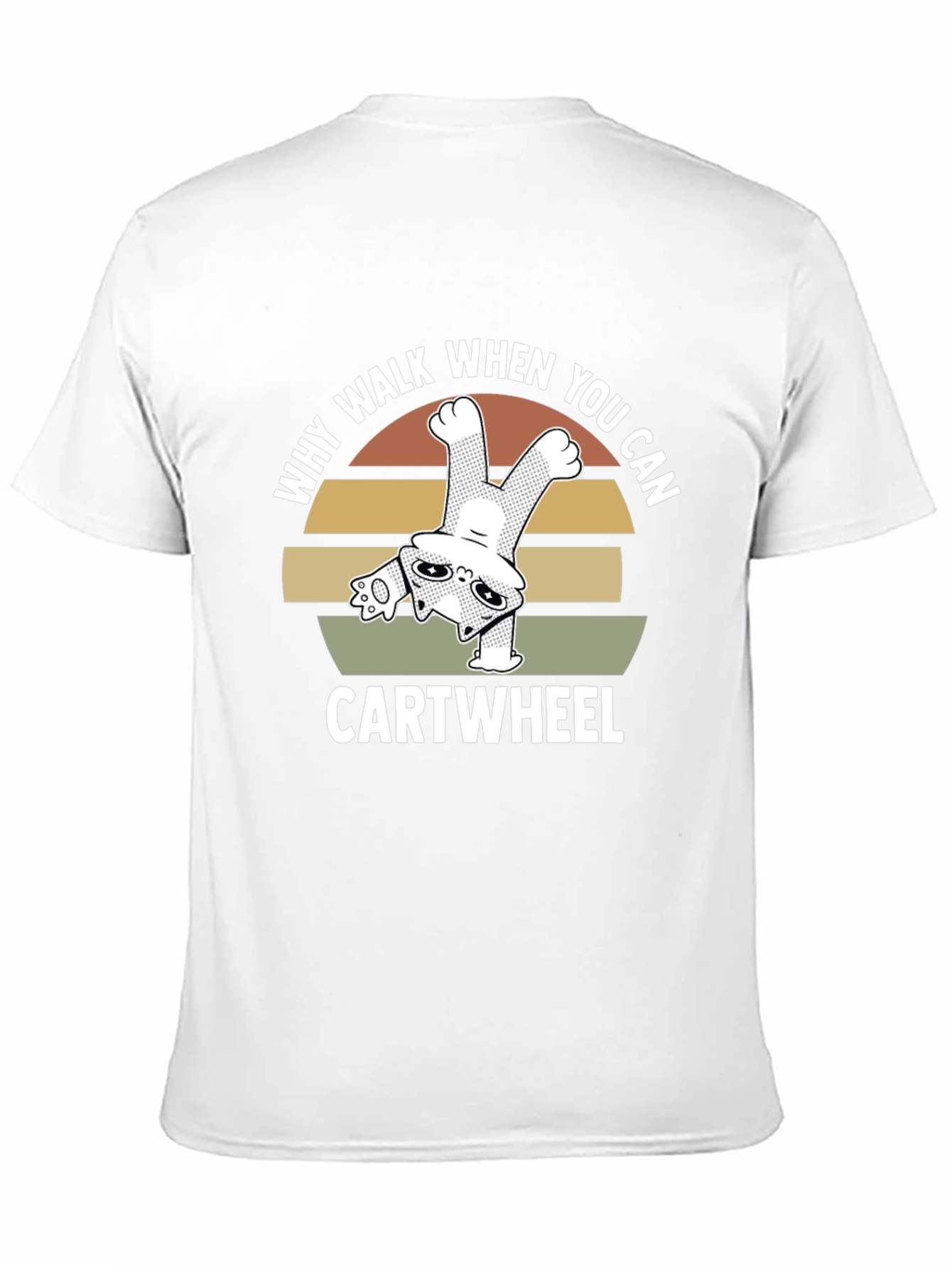 Showcase your love for cats and cartwheels with this unique black graphic tee. Featuring an adorable cat doing a handstand atop a vintage sunset design, complete with the phrase "Why Walk When You Can Cartwheel." Made from a soft and comfortable fabric, this shirt is perfect for casual wear, workouts, or as a fun gift for cat lovers and gymnasts alike. The bold design stands out, making it a great conversation starter wherever you go. Add a playful touch to your wardrobe with this eye-catching t-shirt!