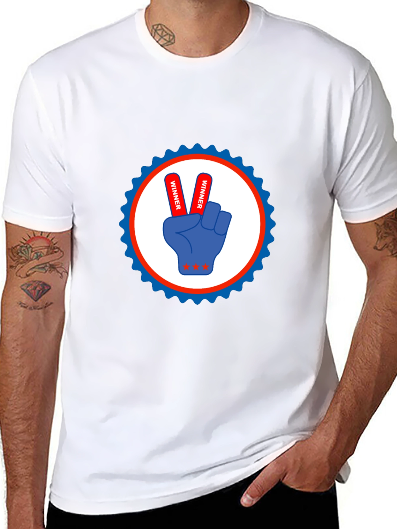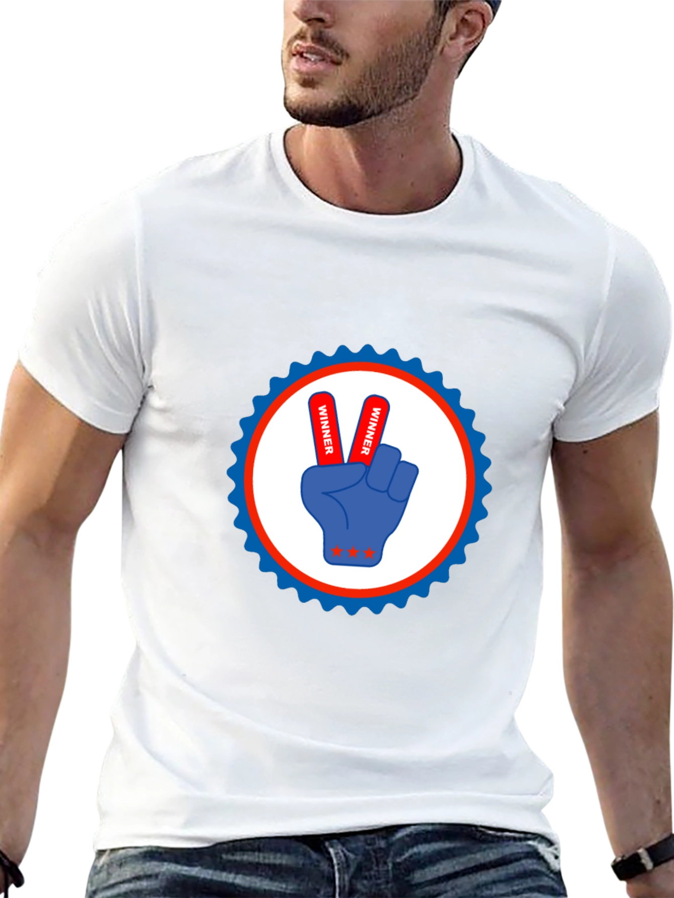 Show off your winning spirit with this eye-catching black t-shirt. The design features a bold "winner" hand gesture graphic with a vibrant red, white and blue color scheme. Made from a soft and breathable fabric, this tee offers both comfort and style. The classic fit makes it ideal for casual everyday wear. Perfect for sporting events, victory celebrations, or simply expressing your confident attitude. Stand out from the crowd and let everyone know you're a winner with this unique and stylish t-shirt.