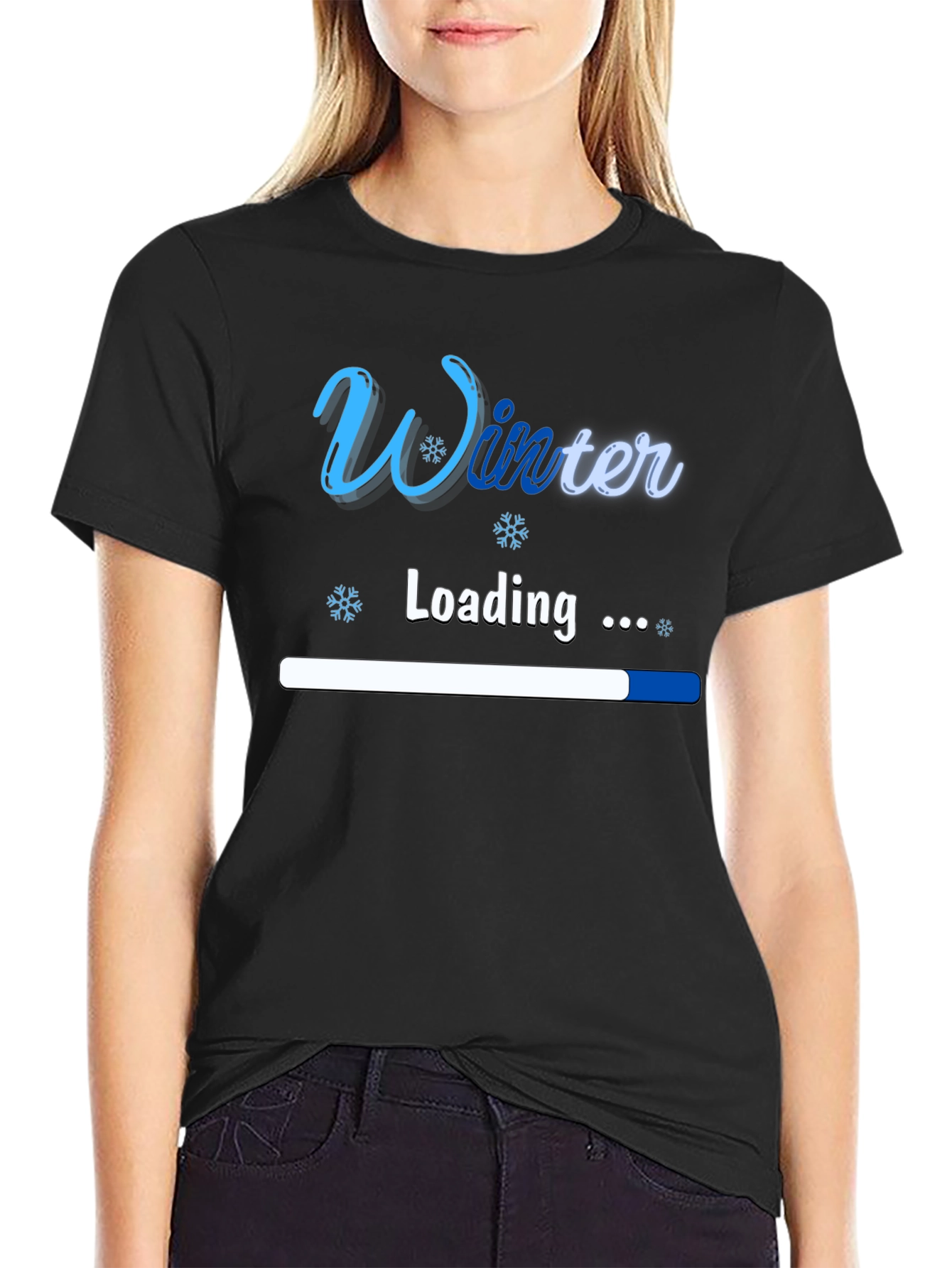 Get ready for the holiday season with this fun and festive "Winter Loading" T-shirt! This black tee features a playful design, with a loading bar indicating the progress towards winter. The word "Winter" is displayed in a stylish, icy blue font, complemented by snowflake graphics. Made from a soft and comfortable fabric, this t-shirt is perfect for casual wear during the chilly months. Show your excitement for the upcoming winter season, holiday festivities, or even as a gift for a winter enthusiast! Enjoy the cozy comfort and unique design of this t-shirt.