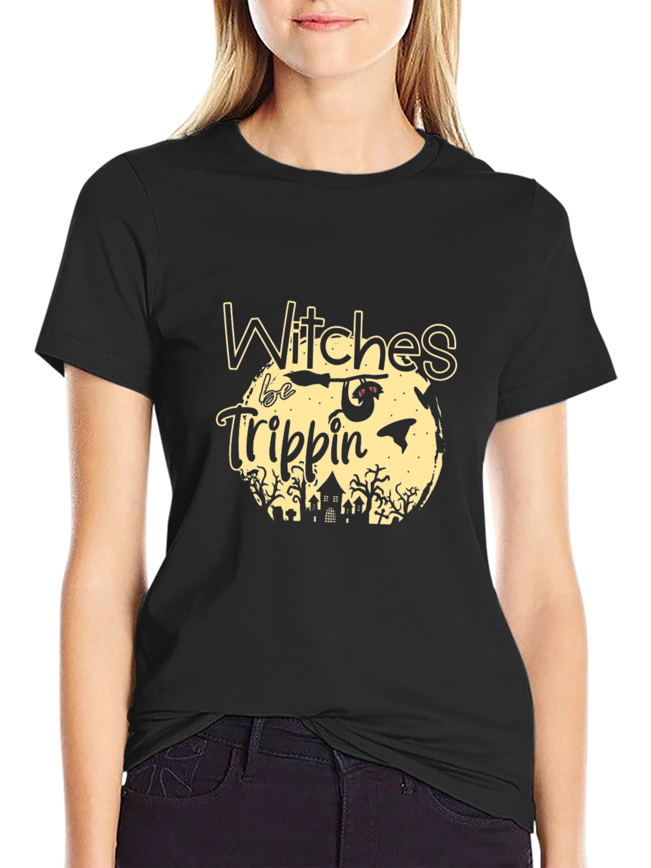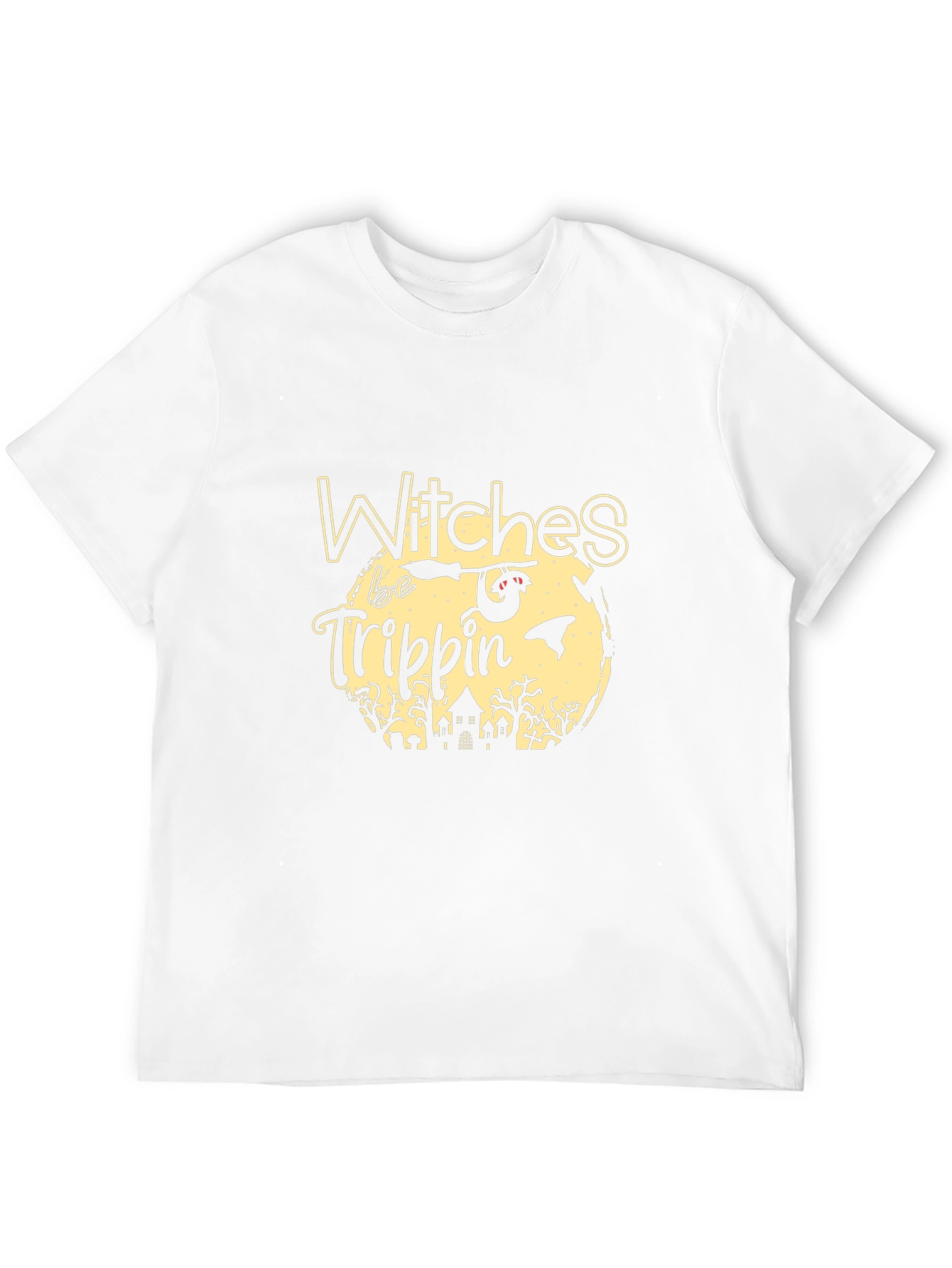 Embrace the spooky season with this stylish "Witches Be Trippin'" graphic t-shirt! This black tee features a unique Halloween-themed design, showcasing a silhouette of a haunted house, spooky trees, a bat, and a witch on a broomstick against a pale yellow moon. The playful lettering adds a fun, festive touch, making it perfect for Halloween parties, casual outings, or simply showing off your love for all things spooky. Made from comfortable fabric, this tee offers a relaxed fit for everyday wear. Stand out this Halloween with this eye-catching and spirited design!