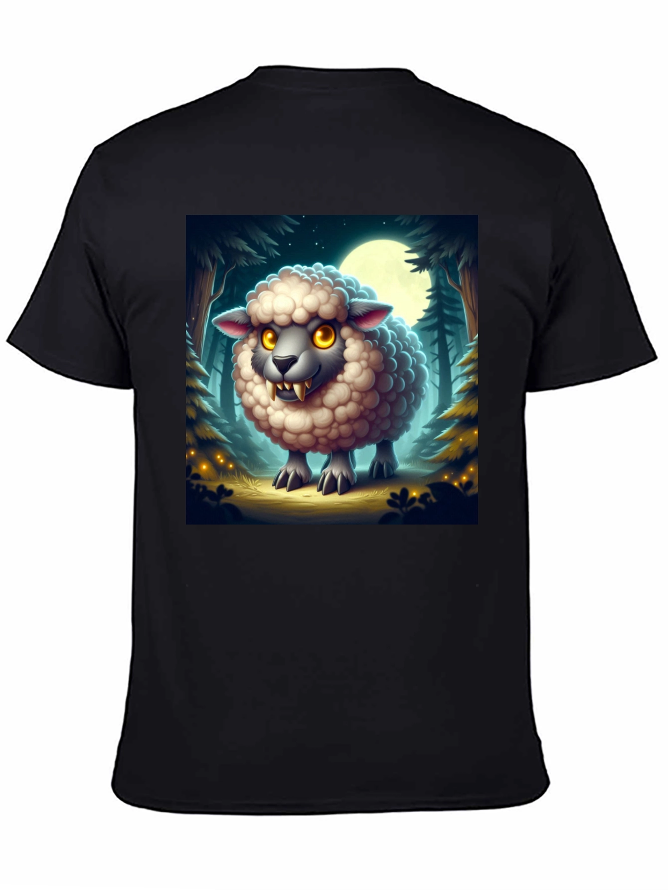 Unleash your inner rebel with this unique black t-shirt featuring a cartoonish wolf in sheep's clothing graphic. The design showcases a fluffy white sheep with sinister fangs and glowing yellow eyes, set against a moonlit forest backdrop. Made from comfortable, breathable fabric, this tee offers a relaxed fit perfect for everyday wear. Show off your playful side with this eye-catching and slightly edgy shirt, ideal for casual outings, social gatherings, or simply expressing your individuality. Get ready to turn heads and spark conversations with this one-of-a-kind apparel!