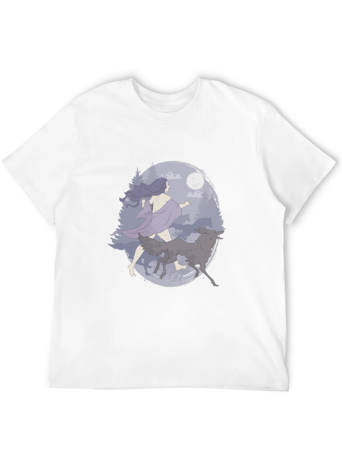 Embrace the mystique with this eye-catching black t-shirt. It features a captivating graphic of a woman running with wolves in a forest under the moon. The design is set within a cool-toned color palette. Made from what appears to be a comfortable, breathable cotton blend, this tee offers a relaxed fit perfect for everyday wear. Express your unique style with this striking and comfortable garment.