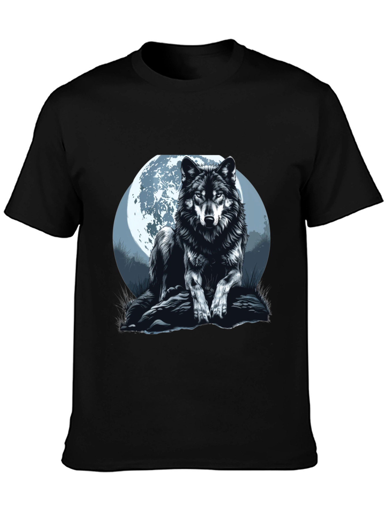 Embrace your wild side with this striking men's black t-shirt. The design features a majestic wolf sitting against a full moon backdrop, rendered in detailed monochrome graphics. Made from a comfortable-looking fabric, this tee offers both style and comfort. The classic crew neck and short sleeves ensure a relaxed fit, making it perfect for casual wear. Whether you're out with friends or just lounging at home, this unique wolf graphic tee is sure to make a statement. Show off your love for wildlife and make a bold fashion choice with this eye-catching t-shirt.