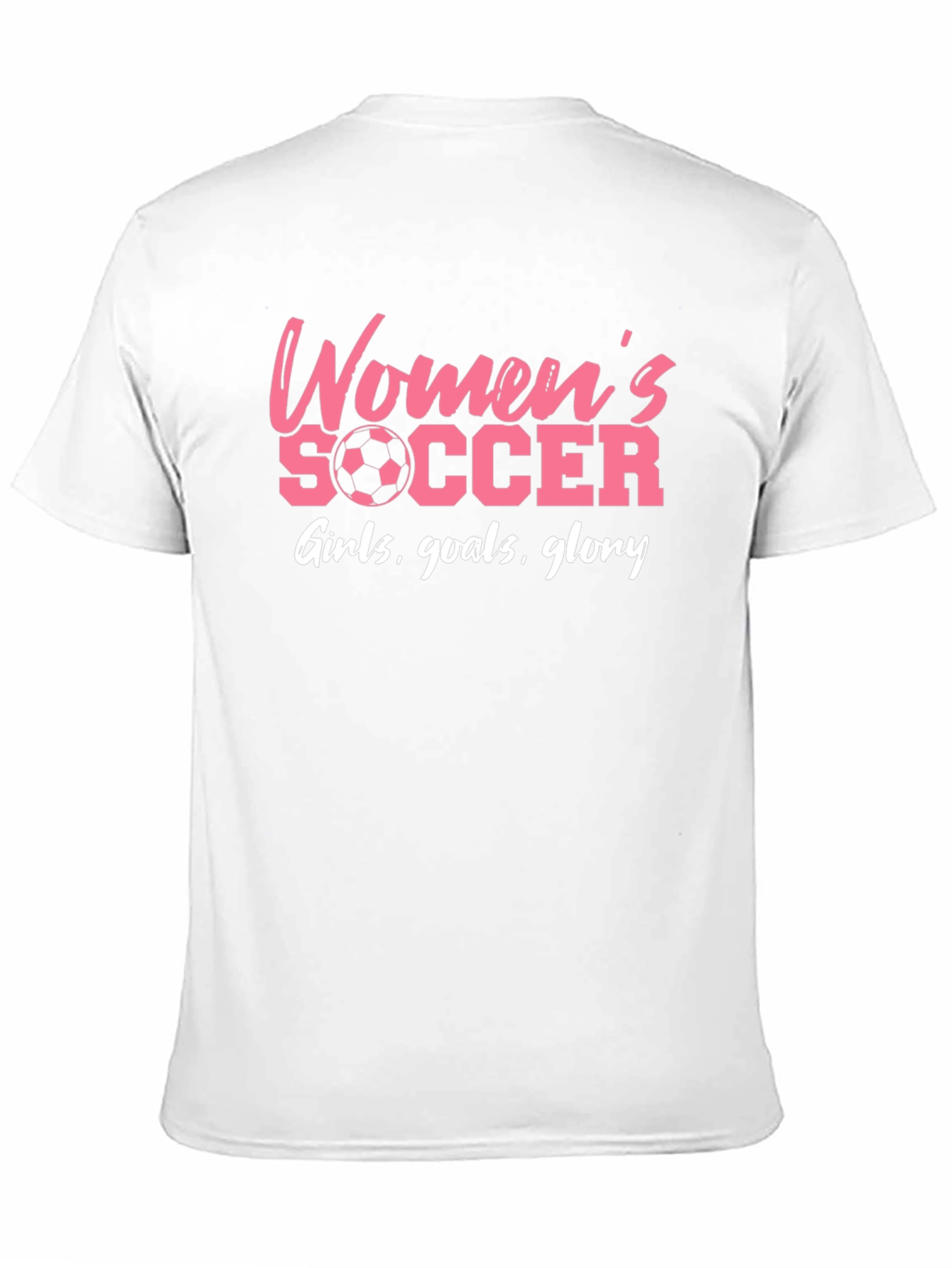 Show your love for women's soccer with this stylish graphic tee! This black t-shirt features a vibrant pink design that proudly displays "Women's Soccer" alongside a soccer ball graphic. The playful phrase "Girls, goals, glory" completes the sporty look. Made from a comfortable-looking fabric, this tee is perfect for wearing to games, practices, or casual outings. A great way to support your favorite team or player, this t-shirt combines fashion and passion in one eye-catching garment. Perfect for athletes and fans alike!