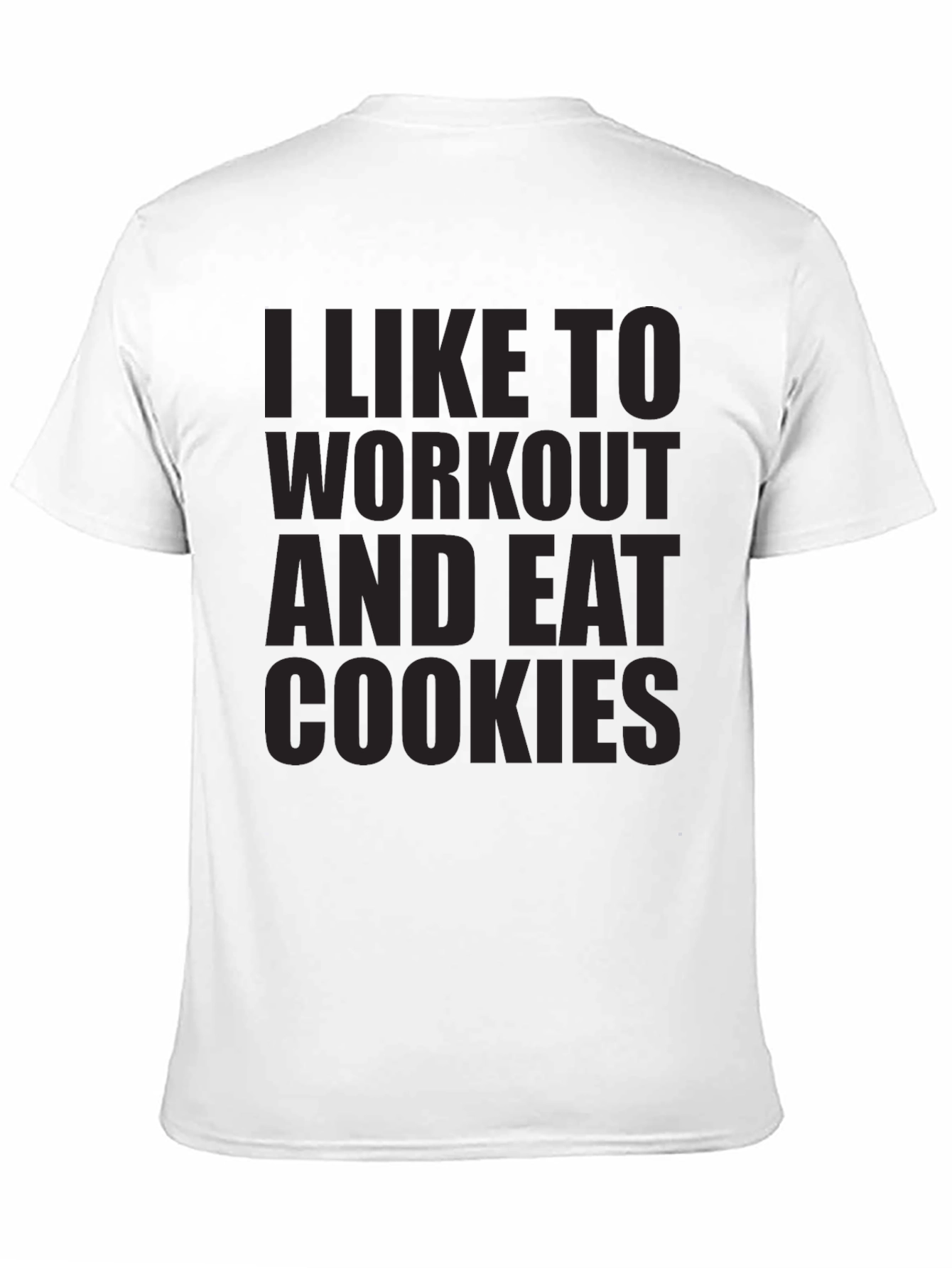 Show off your love for fitness and treats with this fun, relaxed-fit t-shirt! The bold graphic proclaims 'I Like To Workout And Eat Cookies'. The shirt appears to be made from a soft, comfortable material and has a classic crew neck. Its casual style is perfect for the gym, running errands, or lounging at home. The dark color is versatile and can be easily paired with your favorite jeans or shorts. Express your fun personality with this unique and comfortable tee!