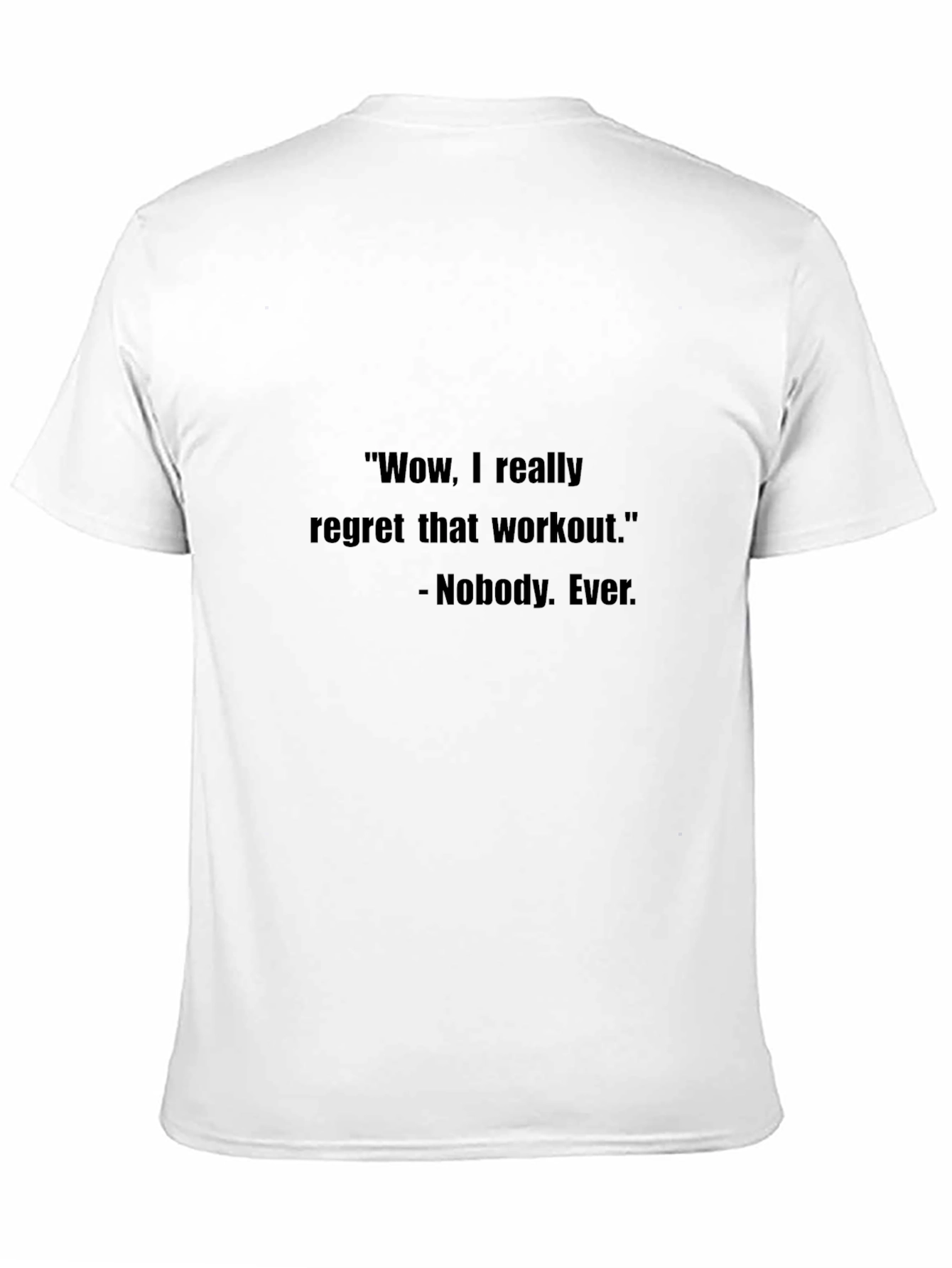 This black t-shirt features a humorous quote: "Wow, I really regret that workout. - Nobody. Ever." It's perfect for gym enthusiasts and anyone with a sense of humor about fitness. Made from a comfortable-looking fabric, this tee is ideal for workouts or casual wear. Show off your dedication to fitness with a touch of wit. It's a great conversation starter at the gym or a fun addition to your everyday wardrobe. The classic fit ensures comfort and style.