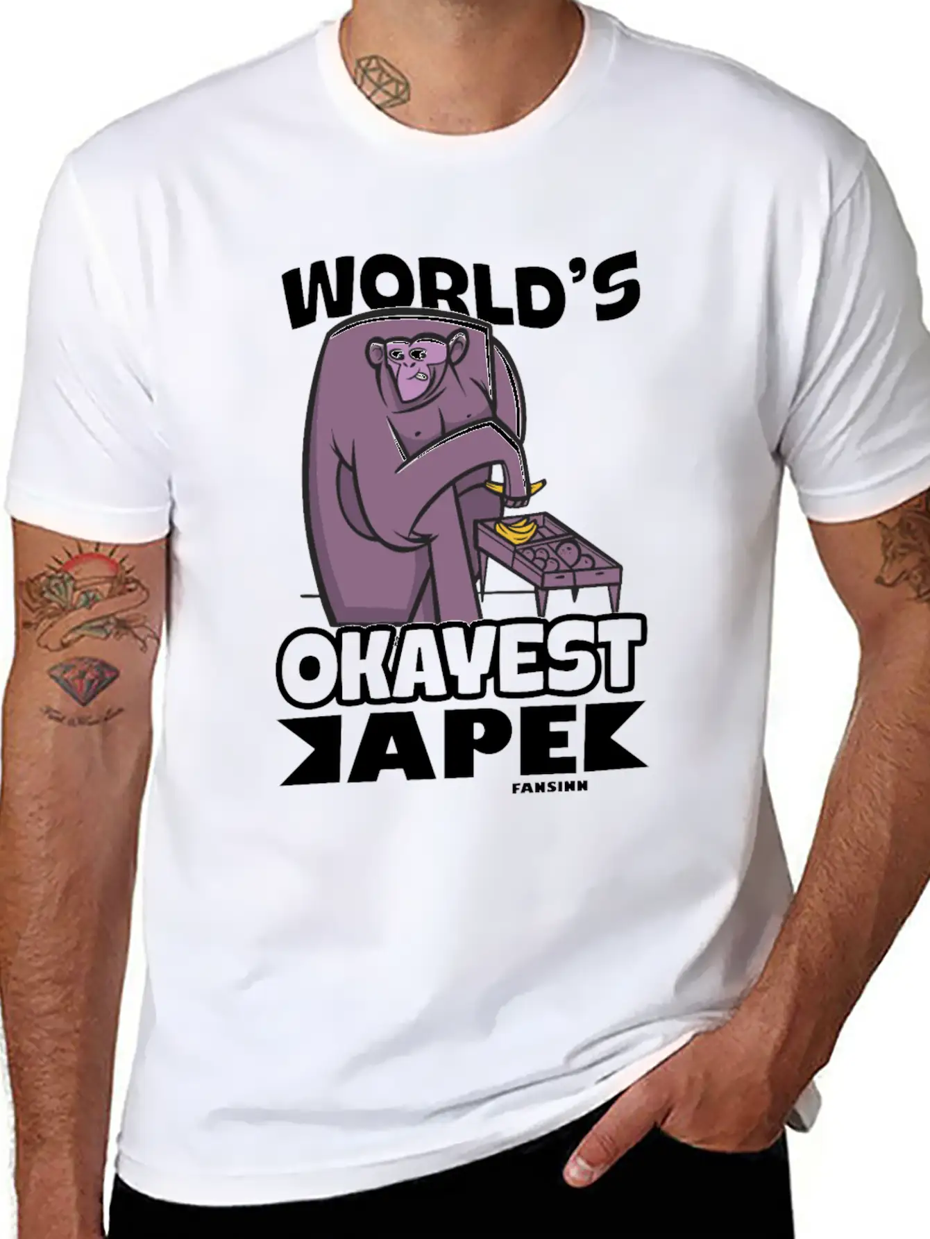 This shirt showcases the World's Okayest Ape in a sleek and subtle way. A must-have for fans of timeless design. Pure cotton feel.