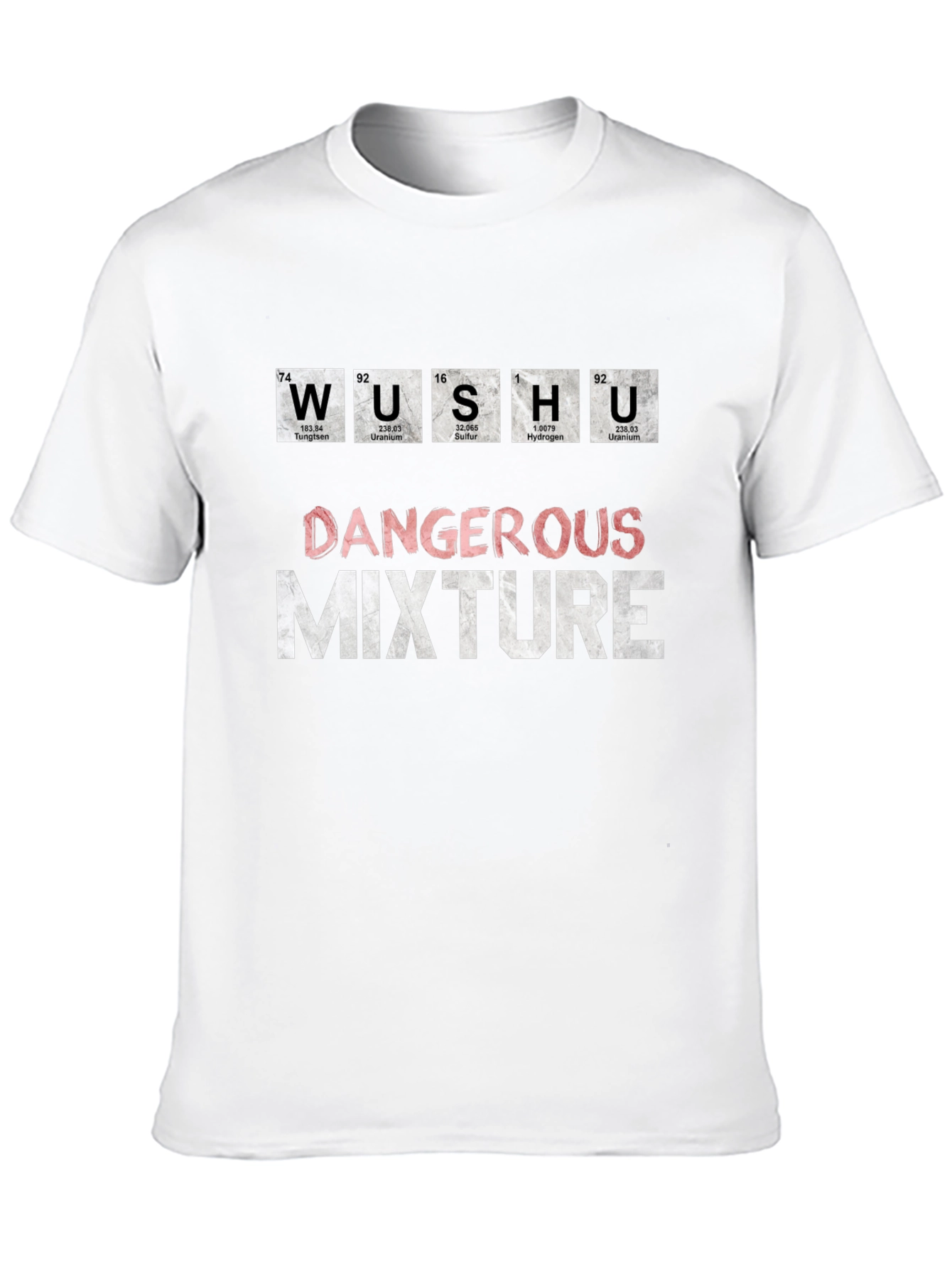 This bold black t-shirt features a unique design for Wushu enthusiasts. The graphic incorporates the periodic table elements to spell "WUSHU", with the words "DANGEROUS MIXTURE" printed below in a striking contrast of pink and white. Made from a comfortable-looking fabric, this tee is perfect for casual wear, gym sessions, or showcasing your passion for martial arts. It's a statement piece that blends scientific humor with athletic style, making it a great conversation starter and a fun addition to any wardrobe. Wear it to your next Wushu class, or simply when you want to make a cool and confident statement.