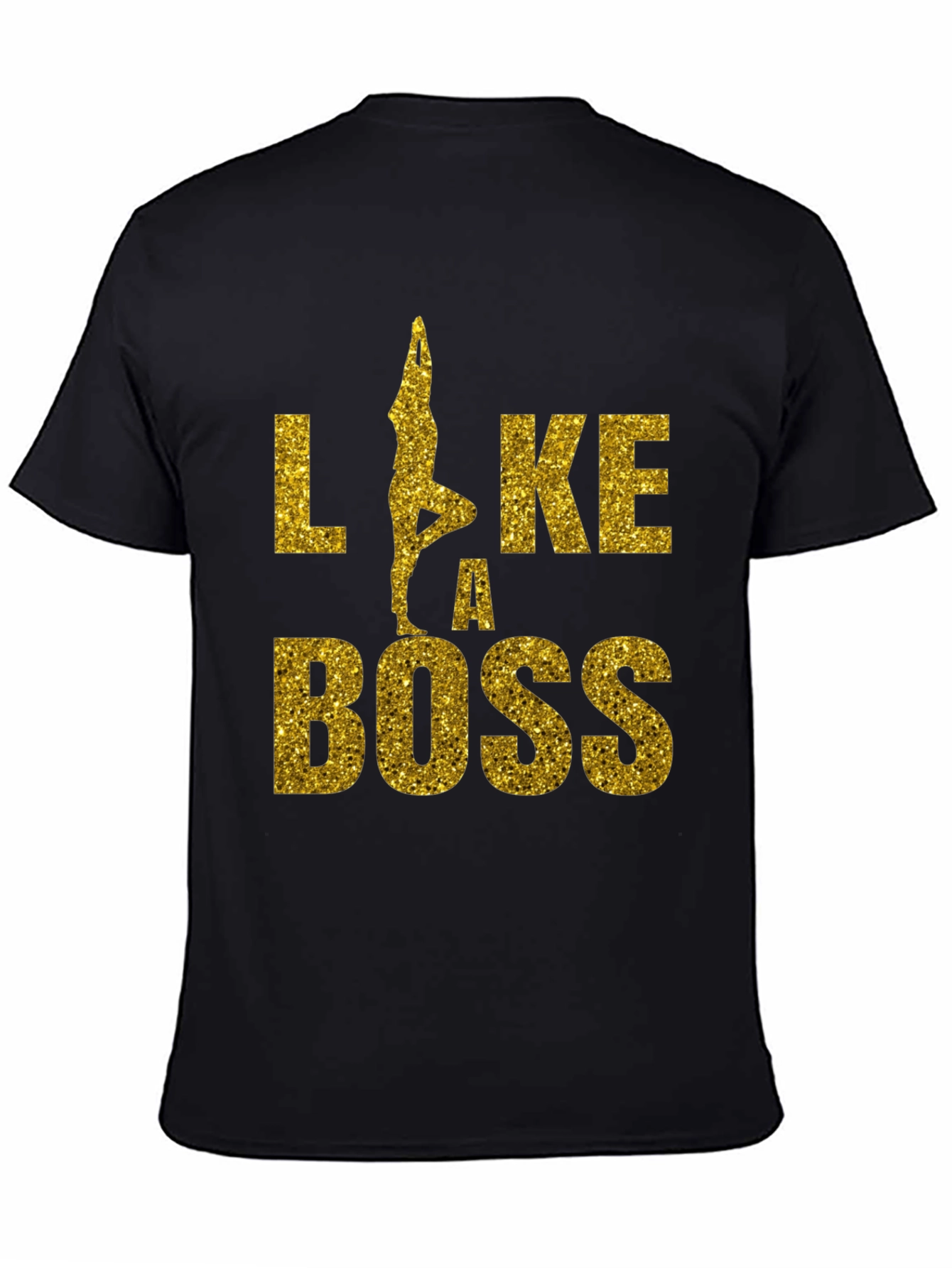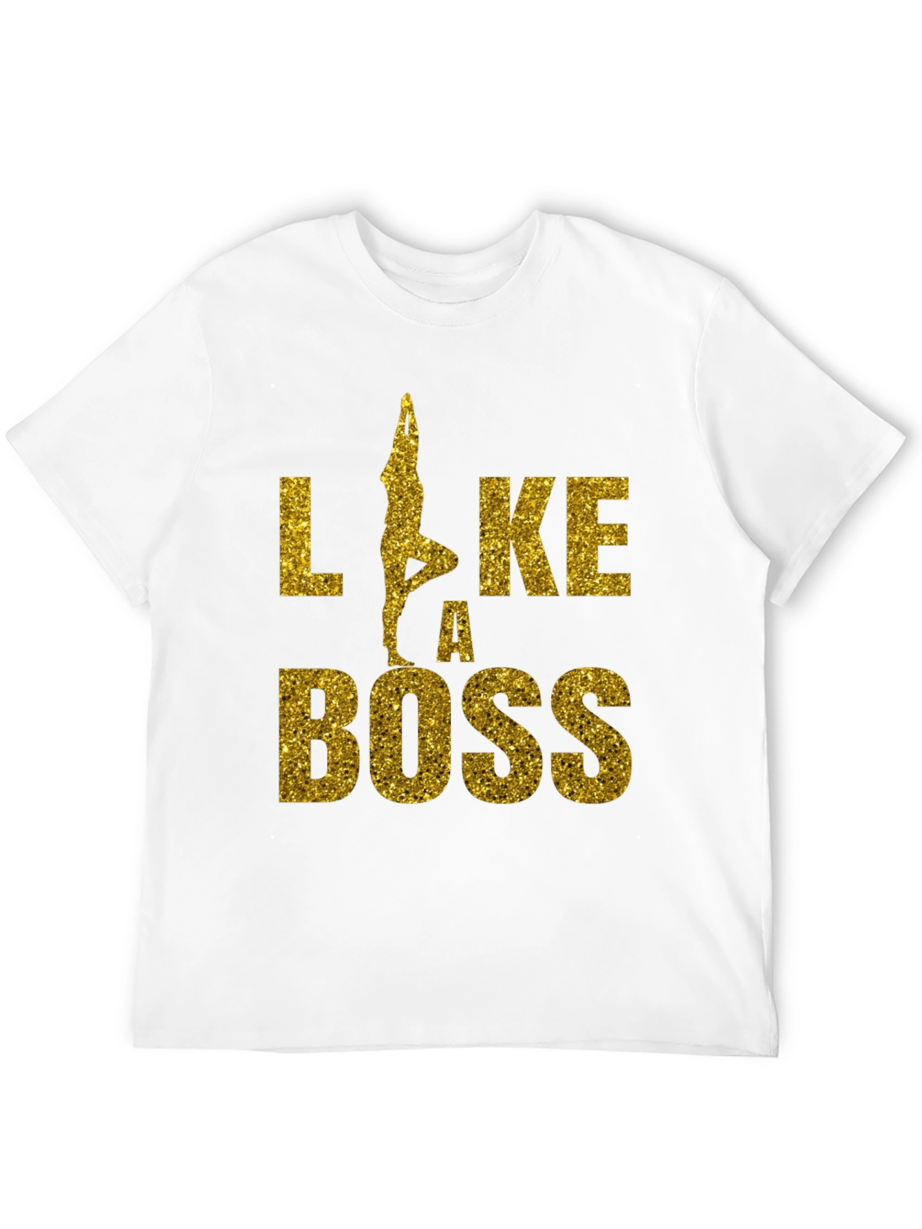 Elevate your style and attitude with this bold black t-shirt featuring a striking gold-colored graphic design. The design showcases the phrase "LIKE A BOSS," cleverly incorporating a yoga pose in place of the letter 'I,' creating a fun and empowering statement piece. Crafted from a comfortable fabric, this tee is perfect for everyday wear or as a conversation starter at your next yoga class. Show off your confident, yogi spirit with this unique and eye-catching t-shirt. Ideal for casual outings or relaxed days, this tee adds a touch of personality to any outfit. Get yours today and inspire those around you!