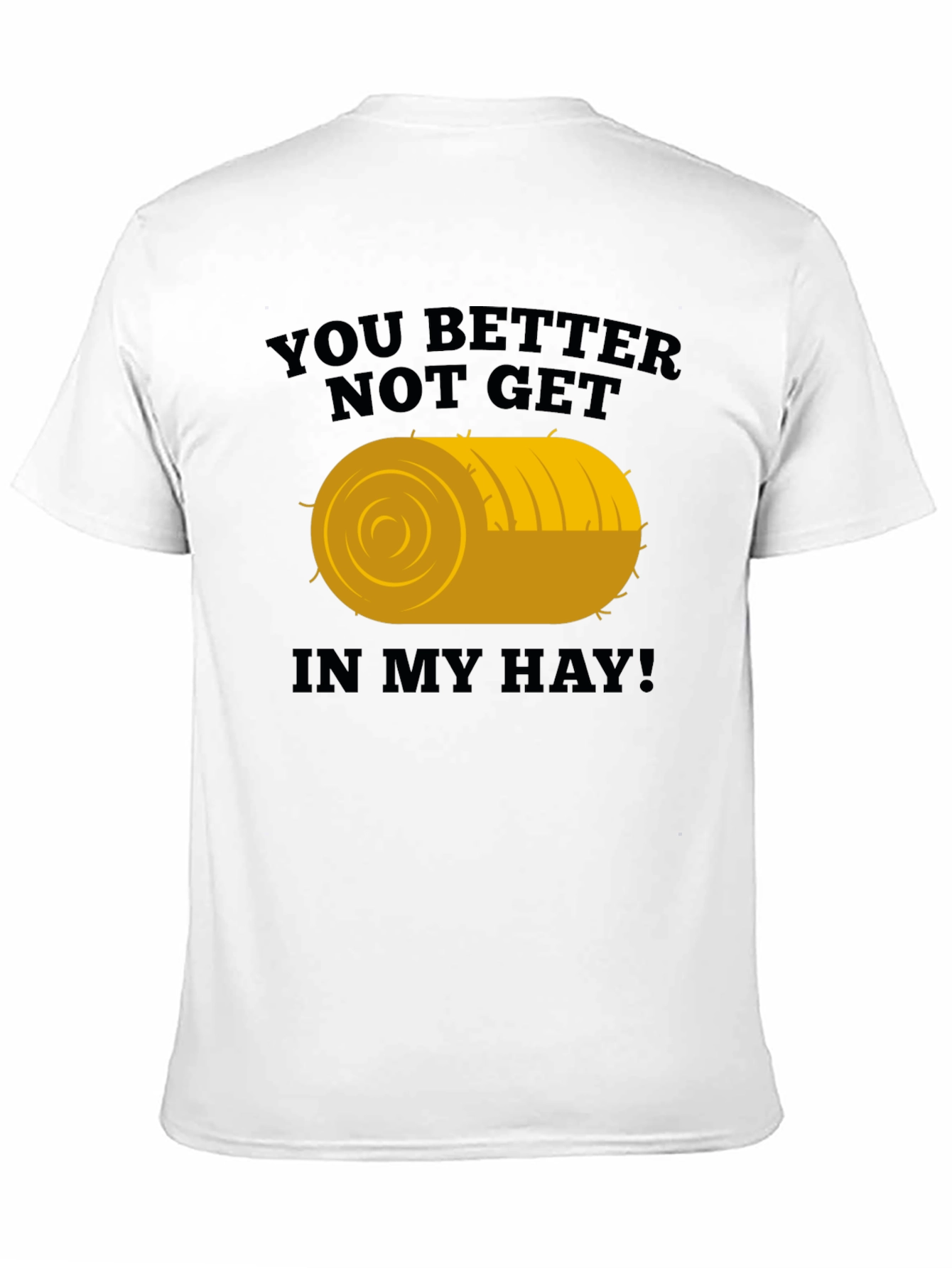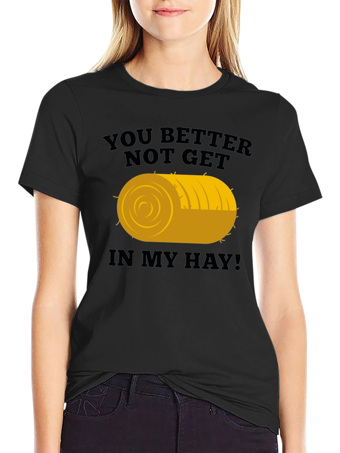 This black t-shirt features a humorous design with the phrase "YOU BETTER NOT GET IN MY HAY!" printed above and below a cartoon image of a hay bale. The design is simple yet eye-catching, making it a fun and unique addition to any casual wardrobe. Made from what appears to be a soft, comfortable fabric, this tee is perfect for everyday wear. Show off your sense of humor and love for country life with this playful graphic tee, ideal for casual outings, weekend adventures, or just lounging around at home.