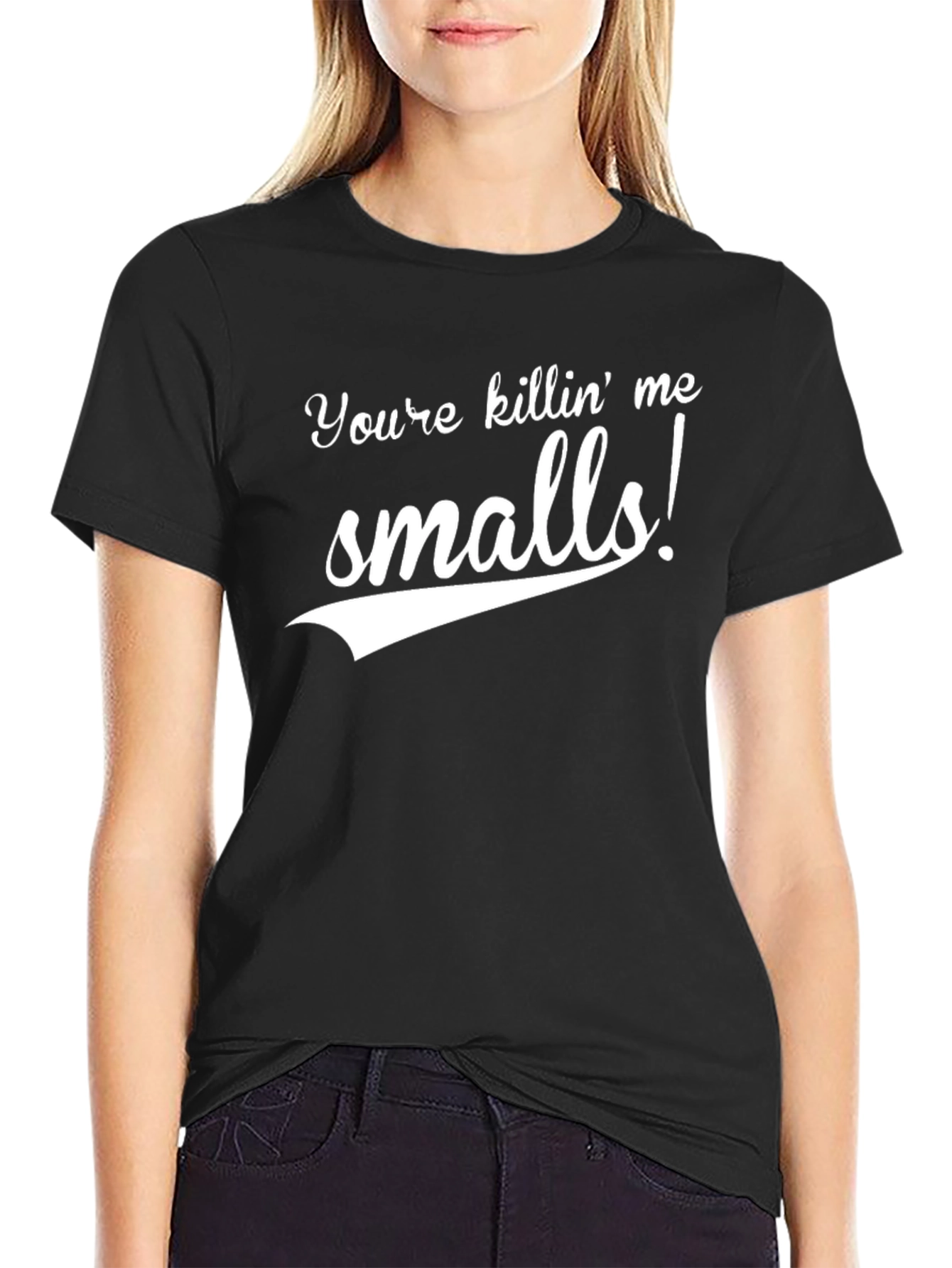 Show off your sense of humor with this stylish black t-shirt! The tee features the catchy phrase "You're killin' me Smalls!" in a cool, vintage-inspired white font. The design has a classic baseball style, giving it a sporty and fun touch. Made from soft, comfortable fabric, this t-shirt is perfect for everyday wear. Dress it up with jeans and a jacket, or dress it down with shorts for a casual look. Makes a great gift for movie buffs or anyone who appreciates a good laugh!